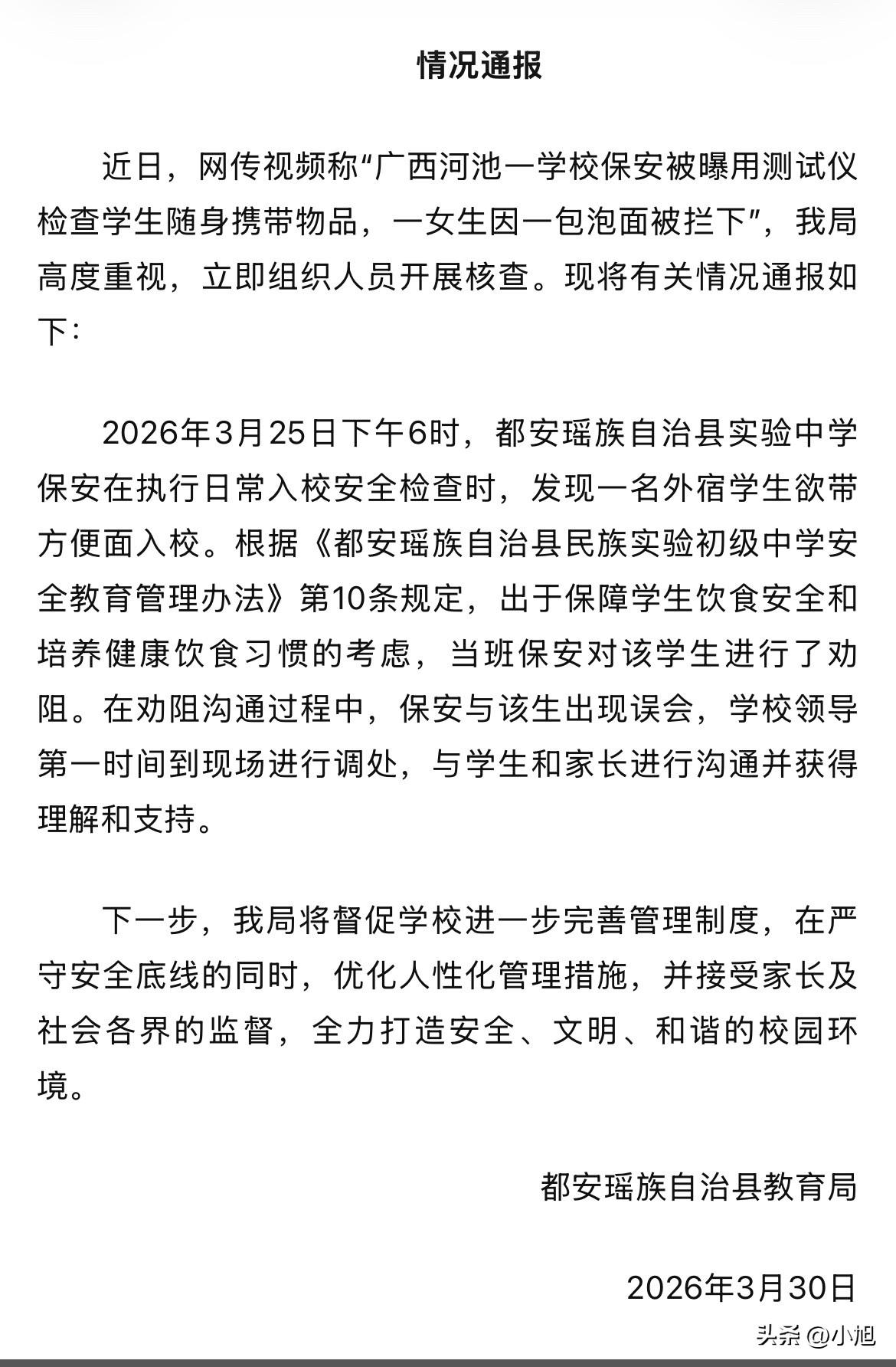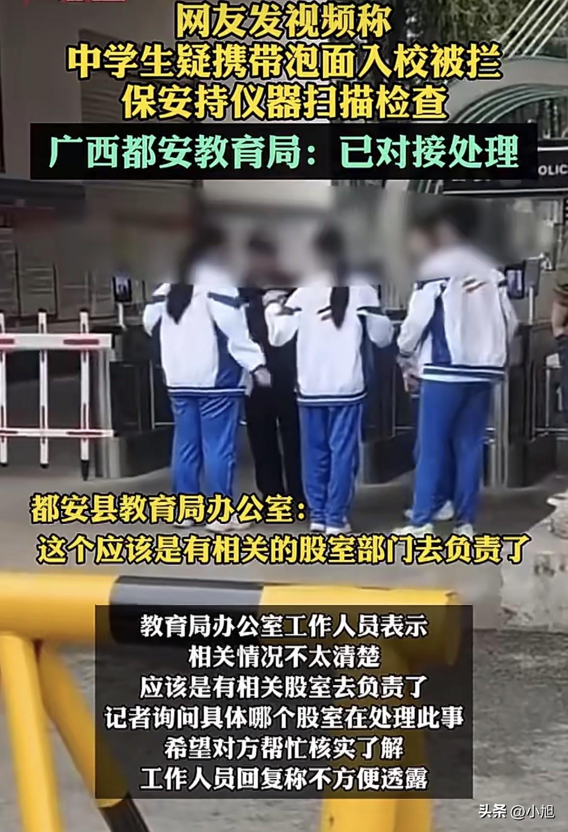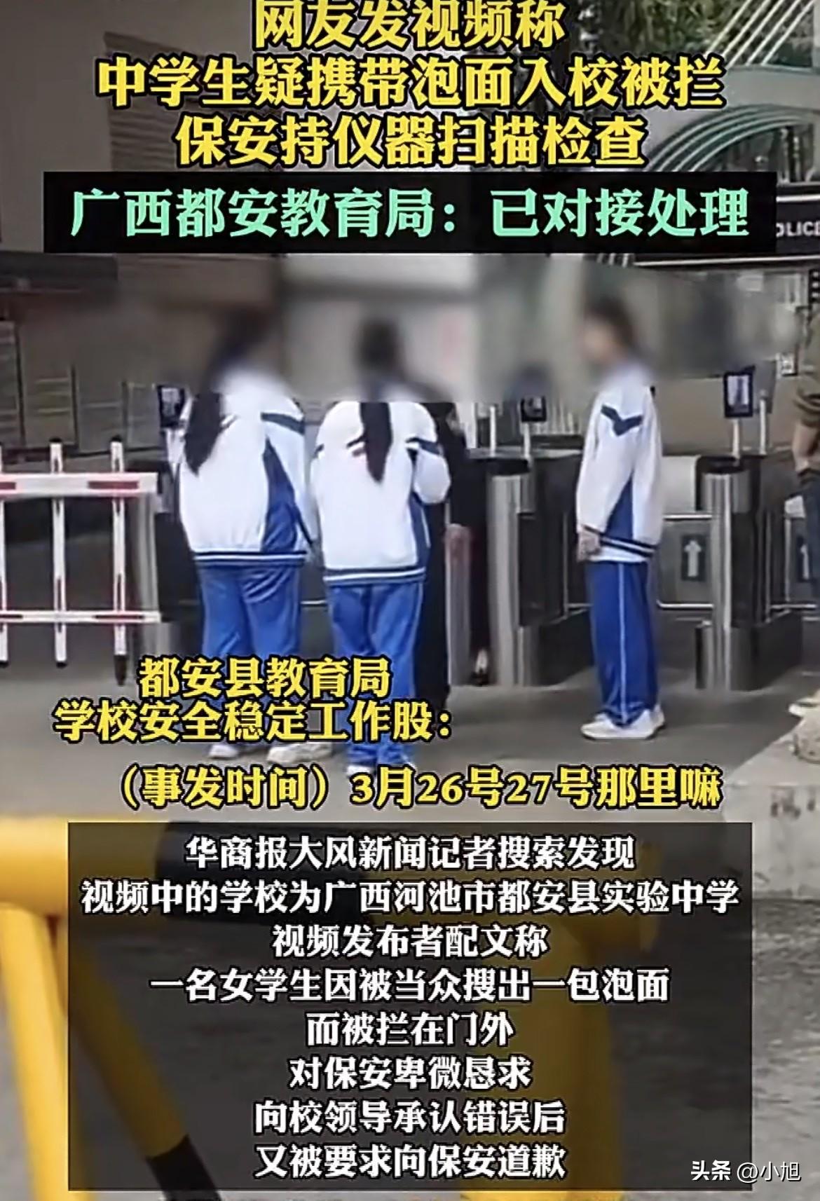 3月25日下午六点,广西河池都安瑶族自治县实验中学门口,一个女生正要进校门。保安手里的黑色检测仪扫过她口袋的时候,突然发出了警报声。 周围的学生都扭头看过来。 保安从她口袋里翻出一包泡面。就是超市里几块钱一包的那种,红烧牛肉面,包装袋上印着大块牛肉的图片。 女生站在校门口,手里攥着那包泡面,跟保安解释。可能是早上没来得及吃早饭,留着垫肚子的。也可能是放学路上顺手买的,想带回学校当晚饭。 但保安没让她进去。 网上的视频里,保安不光用检测仪扫,还拉扯她的衣角,翻看衣兜。整个过程被路人拍了下来。 后来女生去找了校长,承认了错误。 她回来的时候,对着保安鞠了一躬,说了声对不起。 这段视频在三天后突然刷屏。画面里,女生的马尾辫随着鞠躬的动作轻轻晃动,保安站在门禁机旁边,手背在身后,制服上的校徽在镜头里特别清楚。 3月30日晚上,都安县教育局发了通报。 通报说,这件事发生在3月25日下午6点。保安是在执行“日常入校安全检查”,发现这名外宿学生要带方便面入校。根据学校《安全教育管理办法》第10条,出于保障学生饮食安全和培养健康饮食习惯的考虑,保安对她进行了劝阻。 通报里用了“误会”这个词——劝阻沟通过程中,保安与该生出现误会。学校领导第一时间到现场调处,和学生、家长沟通后获得了理解和支持。 仔细看这个时间线:下午六点被拦下,学校领导很快就到了,和家长沟通完,事情解决了。 女生鞠躬道歉那个画面,其实是事情已经处理完的时候。 但这个画面太扎眼了。一个穿着校服的女生,手里攥着一包泡面,对着穿制服的保安弯下腰。 她到底在为什么道歉? 如果是违反校规带了泡面,那处理泡面就行了——没收,或者让她放在门卫室,放学再拿走。办法有的是,几分钟就能解决。 但她最后需要去“承认错误”,还要回来“向保安道歉”。 这就不是“带了泡面”的问题了。这是在为“挑战了执行规则的人”道歉。 有网友把这个画面和通报连在一起看,说了一句话:不知道的还以为她带了什么违禁品。 仔细想想确实奇怪。一包泡面,正规厂家生产的预包装食品,保质期印得清清楚楚,配料表写得明明白白。它到底有什么“危险性”,需要用检测仪来查? 通报里说,学校这么做是“保障学生饮食安全和培养健康饮食习惯”。 这个理由听起来没毛病。学校食堂的饭肯定比泡面有营养,让学生少吃泡面,这话哪个家长听了都会点头。 但问题是,一个外宿生,可能是饿着肚子,顺手在路边买了一包泡面。她可能没想那么多,就觉得饿了能吃口热的。 结果被检测仪扫出来,被拦在校门口,最后还要鞠躬道歉。 有人专门查了学校的“禁带物品清单”,发现除了易燃易爆品,连酸奶、面包都被列入“影响教学秩序”的范畴。 这就让人想不通了。酸奶和面包,也是“不健康”的吗? 网上有人说,这些年校园食品安全出过事,但出事的往往是学校食堂——变质食材、不实惠配餐、过期牛奶。从来没有听说过哪个学生因为吃泡面吃出校园食品安全问题。 所以问题可能不在泡面本身。 都安县教育局在通报最后说,要“优化人性化管理措施”。 “人性化”这三个字,恰恰是这件事里最缺的东西。 那个女生被检测仪扫出来的时候,周围都是同学。她去找校长承认错误的时候,心里在想什么?她回来鞠躬说对不起的时候,是真的觉得自己错了,还是只想赶紧进校门? 这些细节通报里不会写。 但正是这些细节,让一包泡面的事变成了全网关注的热点。 都安实验中学的保安室里,那包引发争议的泡面据说还放在失物招领柜的最上层。包装袋上的“再来一包”字样,在监控灯光下显得格外刺眼。 你觉得,一包泡面该不该被拦在校门口? 来源:央视网、澎湃新闻、大风新闻、北京日报、大象新闻、河池融媒