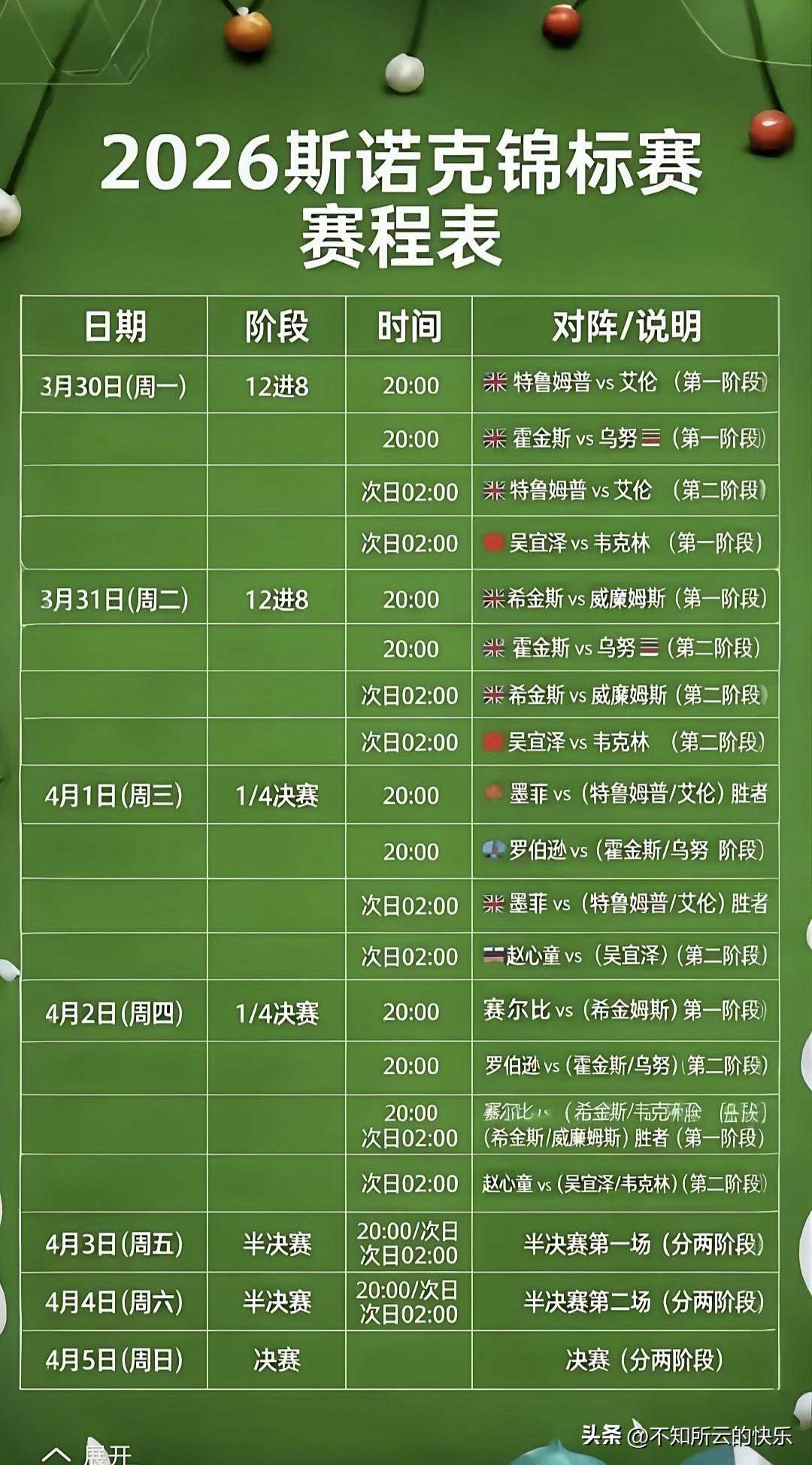 又是凌晨两点,斯诺克巡回锦标赛赵心童最大拦路虎,吴宜泽携6:2领先之势再次登场。 迫切希望赵心童创造历史,眼光看着可能的大敌特鲁姆普&塞尔比,回过头看,吴宜泽很可能才是他最大的拦路虎。 两位精英球员之战更值得期待,胜者扛起中国球员大旗继续前进,负者世锦赛再来一战。 凌晨过后就能知道他们能否一战,当然其它的球员比赛也值得一看,毕竟马叔&巫师这一对宿命之敌看一场少一场,晚8点第一阶段,第二阶段和吴宜泽同步。 还有塔猜亚对战霍金斯这一场一会儿就要开战,一莽到底还是一稳到底睡觉前就能看到结果,比赛预告我也放这儿了,大家提前为中国球员看看对手。
