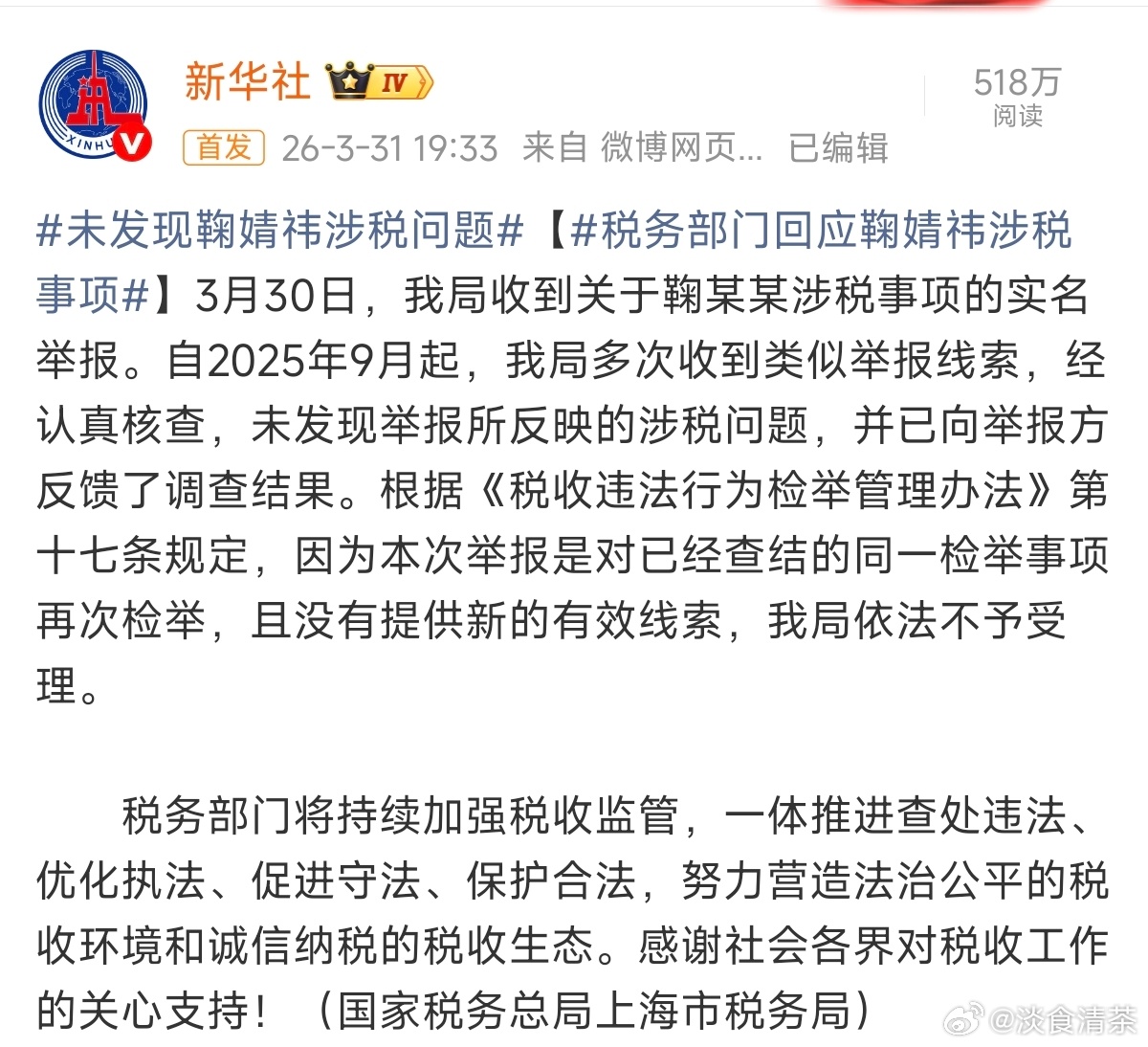 从来没想过,新华社对此事发声了未发现鞠婧祎涉税问题