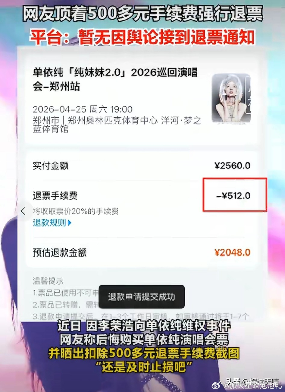单依纯只是有了负面新闻,并没有暂停取消后续演唱会的打算,所以粉丝要退票就得遵守平台的规则,而平台霸道的规则一直存在,只不过以前没有粉丝轻易退票,没有人闹出来罢了。