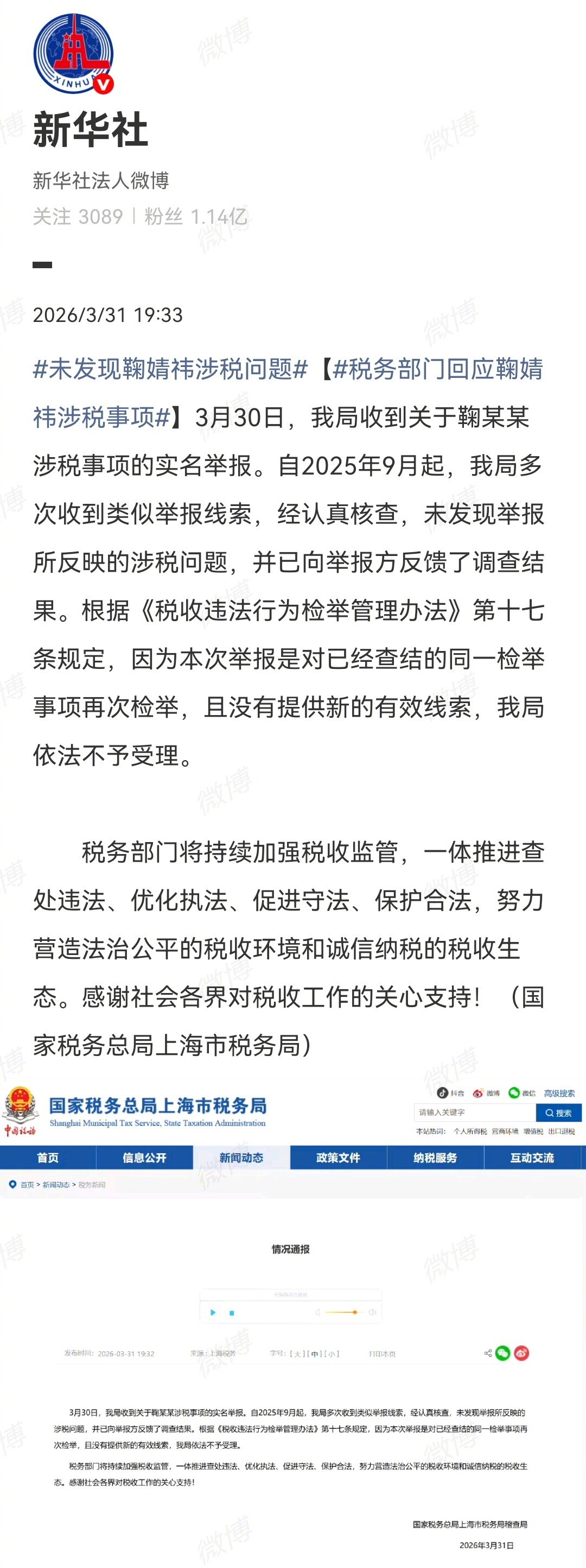新华社和税务总局都出面给鞠婧祎澄清:多次举报核查下来,没发现涉税问题,也没有新的有效线索。也就是说早就有定论,无非是新剧要上有人急了,剧播前想靠舆论施压…现在这场闹剧可以大结局了未发现鞠婧祎涉税问题鞠婧祎涨粉14万