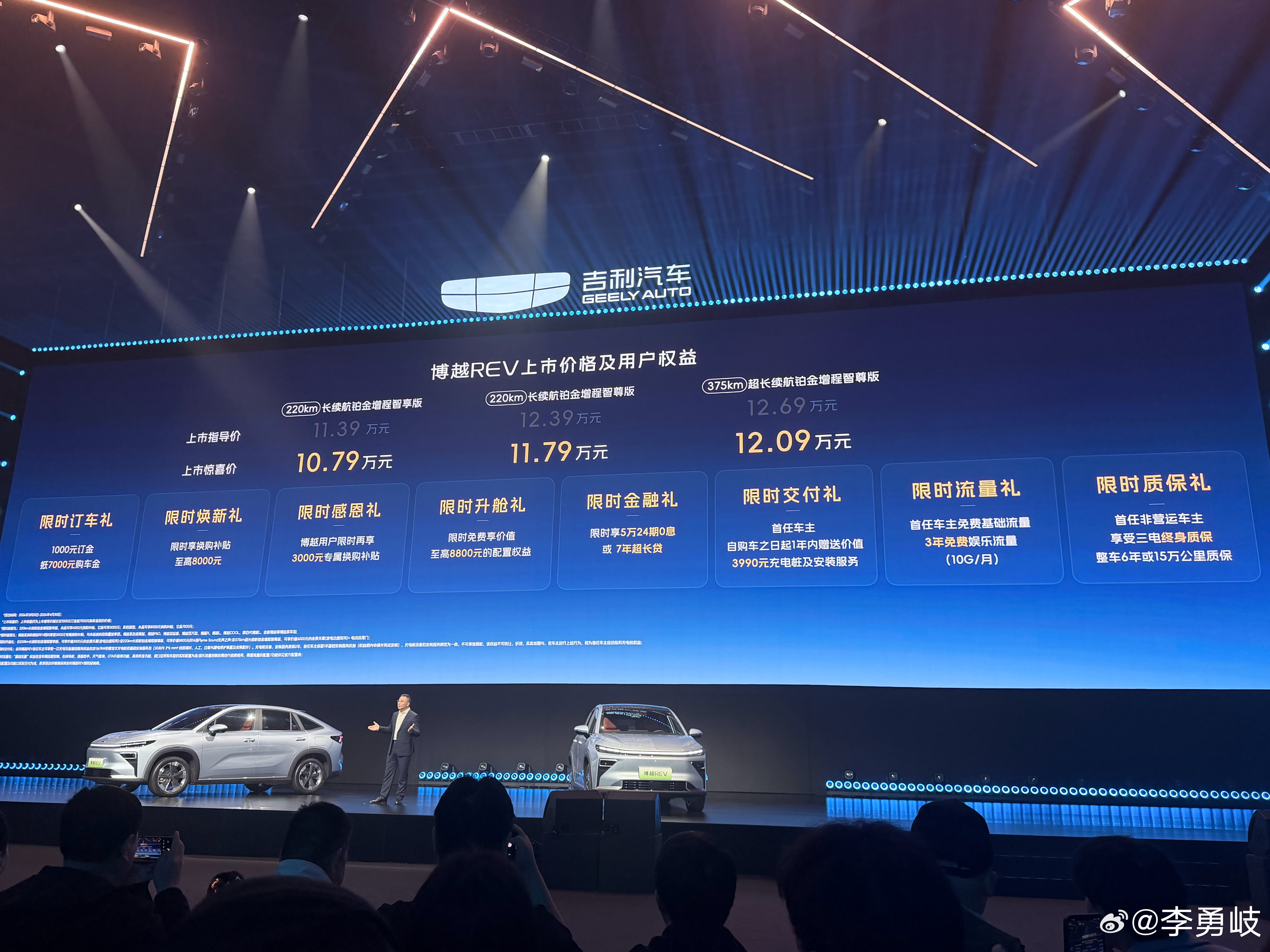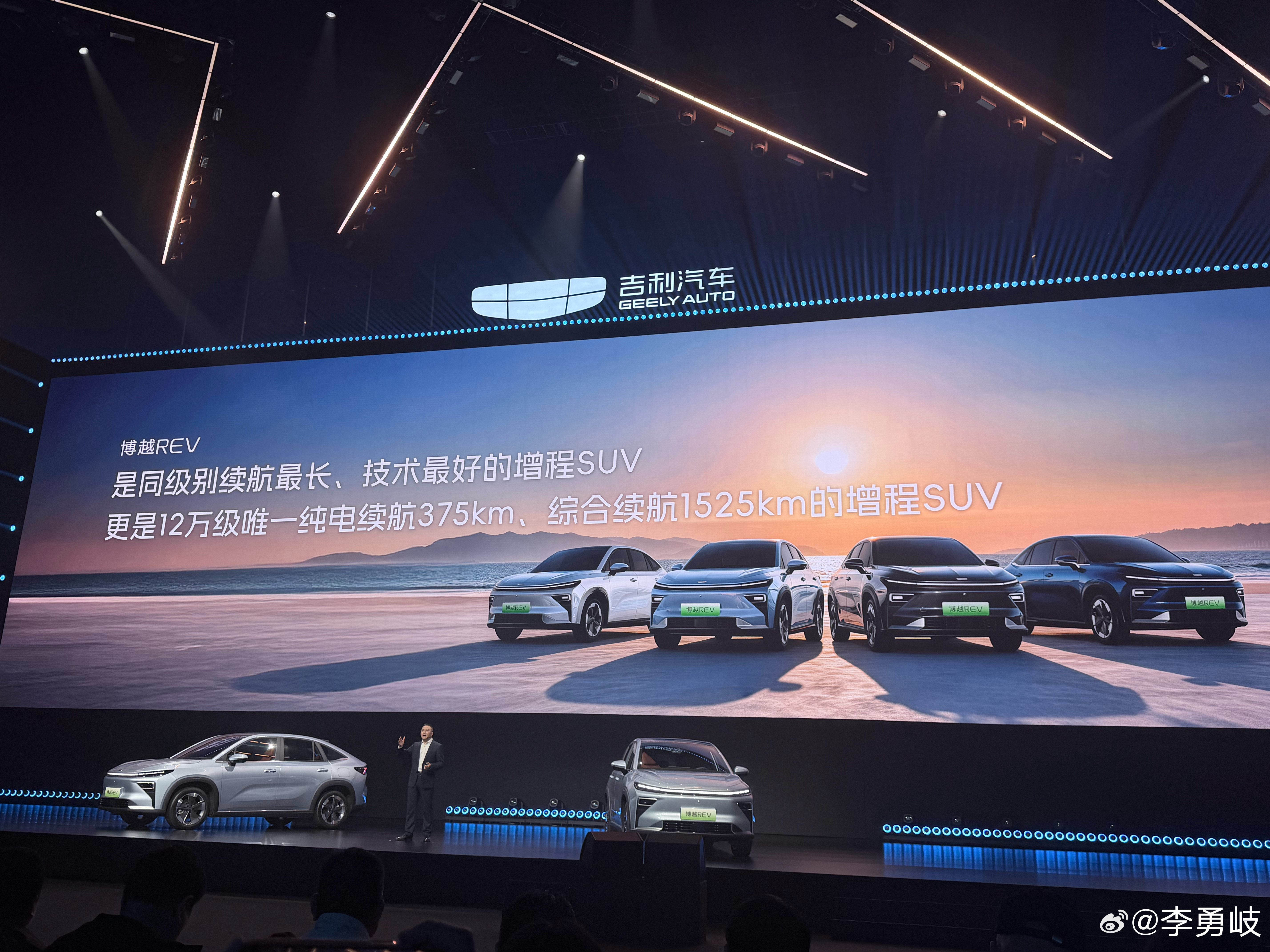 长续航增程SUV杀手来了!吉利博越REV正式上市:售价区间10.79-12.09万元纯电续航375km,综合续航1525km大家要知道,当前市场,超过300公里纯电续航的增程车型,售价大多都在20万以上,博越REV创造了增程SUV价值新标杆的中国实力好增程!可以说,买增程,首选长续航,买长续航增程SUV,选博越REV就对了!新一代长续航增程SUV博越REV全球上市博越REV 杭州·萧山瓜沥文化体育中心