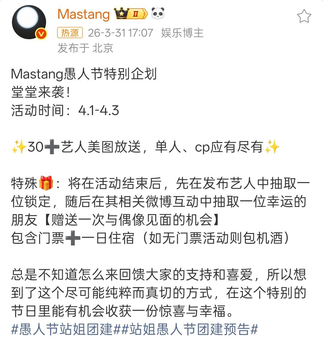 Mastang愚人节活动 送你见你担啊啊啊啊啊有这么好的活动进入愚人节!!想看鞠婧祎!!