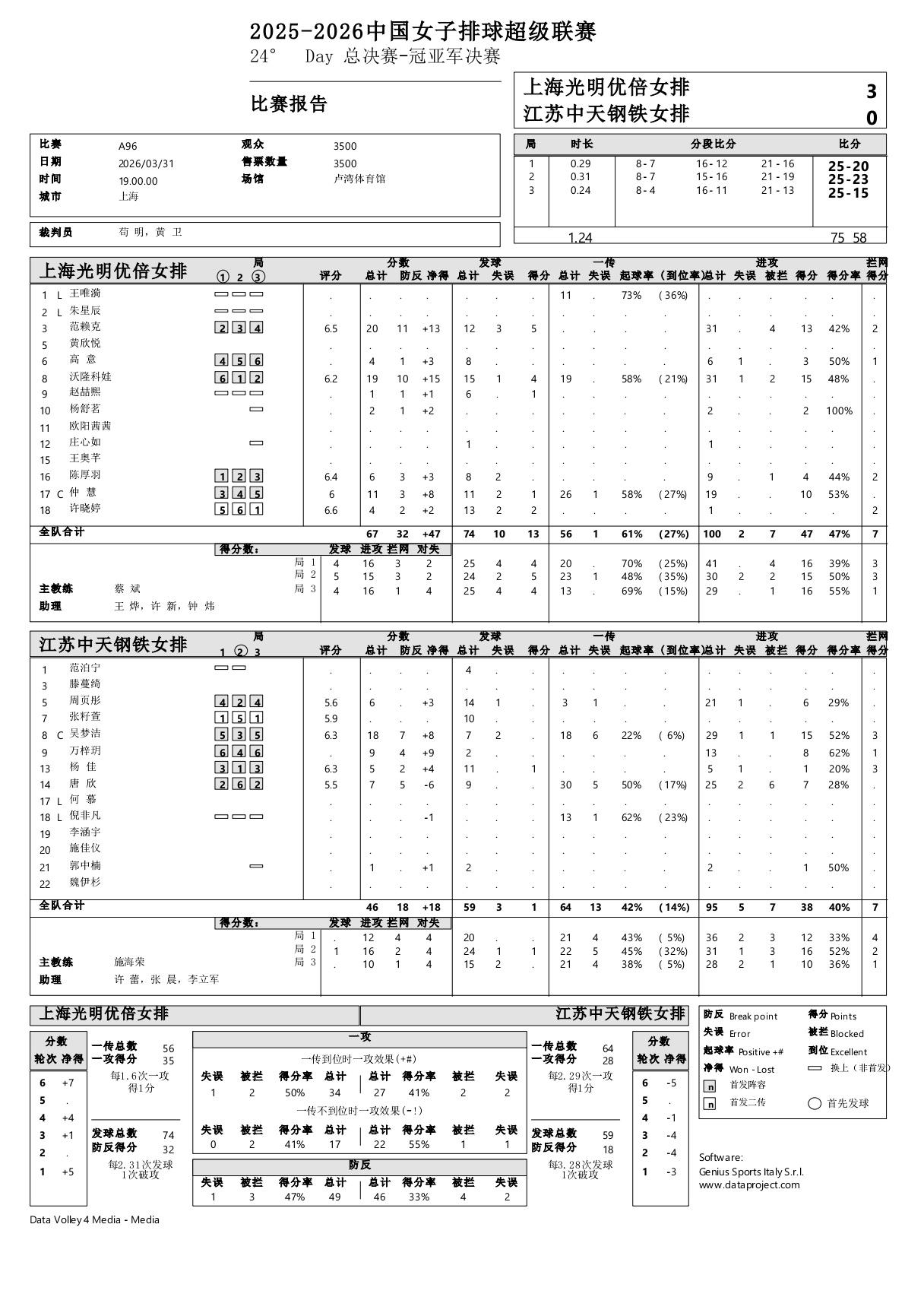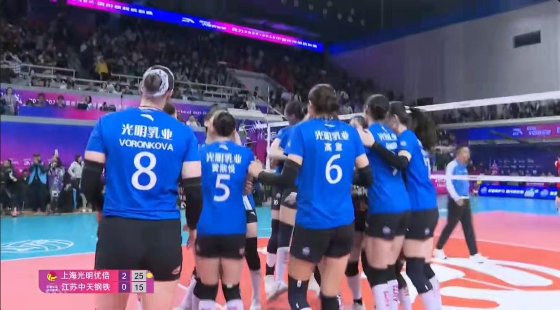 上海发懵江苏,3-0扳回一城 2025-2026中国女排超级联赛冠亚军决赛次回合,上海主场3-0回敬江苏,场分1-1战平,比分25-20, 25-23, 25-15。范赖克13扣2拦5发20分全场得分王,沃隆科娃15扣4发19分次之,吴梦洁15扣3拦18分排名第三。双方将于明晚19:00在卢湾体育馆进行最后一战。 上海: 范赖克31扣13中0失4被拦、2拦5发20分 沃隆科娃31扣15中1失2被拦、0拦4发19分 仲慧19扣10中0失0被拦、0拦1发11分 陈厚宇9扣4中0失1被拦、2拦0发6分 高意6扣3中1失0被拦、1拦0发4分 徐晓婷1扣0中0失0被拦、2拦2发4分 杨舒茗2扣2中0失0被拦、0拦0发2分 赵喆熙0拦1发1分 庄心如1扣0中0失0被拦、0拦0发0分 江苏: 吴梦洁29扣15中1失1被拦、3拦0发18分 万梓玥13扣8中0失0被拦、1拦0发9分 唐欣22扣7中2失6被拦、0拦0发7分 周页彤21扣6中1失0被拦、0拦0发6分 杨佳5扣1中1失0被拦、3拦1发5分 郭中楠2扣1中0失0被拦、0拦0发1分 上海-江苏: 进攻得分:47-38 拦网得分:7-7 发球得分:13-1 对方送分:8-12 总得分:75-58 一传起球率:61%-42% 一传到位率:27%-14% 中国女排超级联赛