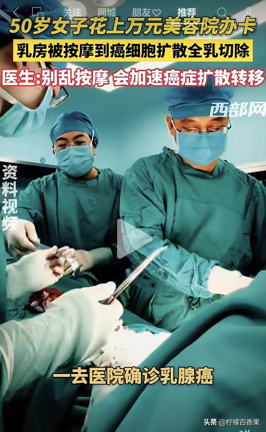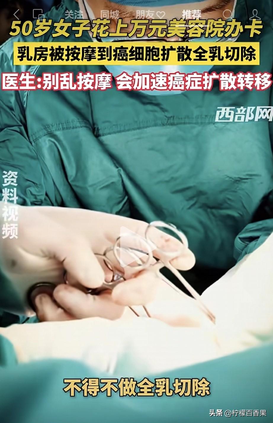 50岁大姐花1万办卡做乳腺按摩,结果被按到癌细胞扩散,全乳切除! 一位50岁的大姐,花上万元在美容院办了乳腺疏通卡。技师摸到她乳房有硬块,张嘴就忽悠:“这是肝气郁结,堵得厉害,得用力按通!”大姐信了,一次次忍着剧痛让技师暴力揉捏,结果没多久,乳房疼得直不起身,去医院一查,直接晴天霹雳:确诊乳腺癌,癌细胞已经被按摩按得扩散,只能做全乳切除手术! 医生的话,每一句都像警钟:乳腺结节、肿块,绝对不能乱按! 尤其是已经有癌变风险的乳房,暴力按摩就是在给癌细胞“推波助澜”,硬生生把早期癌症按成了晚期,把可以保乳的机会,按成了全切的悲剧! 多少姐妹被美容院的“乳腺疏通、排毒散结”话术骗了?以为按一按就能去结节、防乳腺癌?大错特错! 乳房是极其娇弱的器官,根本经不起大力揉捏!正常乳房按多了都会损伤乳腺组织,有结节、肿块的,按一下就是在刺激病灶,癌细胞会顺着按压的力道脱落、转移,直接加速扩散! 真的,姐妹们听我一句劝!乳房有啥不舒服、摸到硬块了,别去美容院瞎耽误功夫!直接去正规医院挂乳腺科,做个B超、拍个钼靶,那才是正经事!美容院那些技师,连行医资格都没有,就敢给你瞎按,出了事人家跑了,遭罪的是你自己!