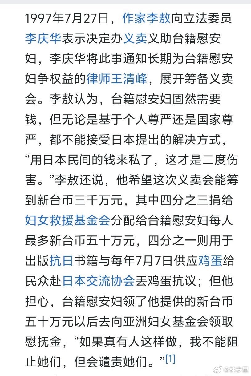 慰安妇受害者生活困难,一点资金可能对于这些凄惨的老人家就能改善生活,国格尊严虽然重要,个人生活也是现实,这时候李敖就站出来了。