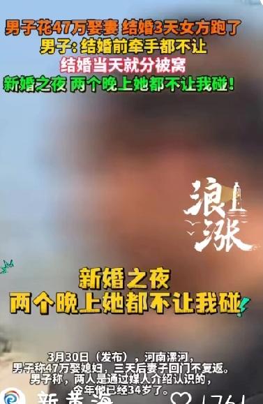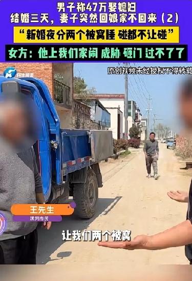 “新婚之夜俩个晚上她都不让我碰”男子花47万娶老婆结果第三天女方就跑了,新婚夜分被窝,第二天就说不认识,这事放谁身上不气愤! 近日河南一位男子的遭遇可以说是相当的糟心。他说自己花了47万娶回来的媳妇,“新婚之夜俩个晚上都不让我碰”不仅如此,第二天媳妇还说不认识他。结婚才三天,媳妇人就跑回娘家不回来了。 据这位男子描述,新婚之夜两个人就是分两个被窝睡的,妻子碰都不让碰。他本以为新婚燕尔,夫妻之间总得有个亲近的过程,可没想到对方连基本的接触都排斥。还没等他弄明白怎么回事,第三天妻子就直接回了娘家,怎么劝都不肯回来。 男方的意思很明白——花了这么大代价,换来的婚姻连三天都没撑住,这事搁谁身上都受不了。 可女方那边也有自己的说法。面对男方的控诉,女子回应称,日子过不下去了是因为男方事后跑到她家闹事,又是威胁又是砸门,闹得鸡飞狗跳。她说自己之所以不愿意再回去,就是因为对方这种处理问题的方式让她害怕,觉得没法继续过日子了。 从新婚夜分被窝这个细节来看,两个人之间的问题显然不是婚后三天才冒出来的。要么是女方心里本来就不情愿,要么是两人在此之前根本没有建立起最起码的亲密感。如果连新婚之夜都透着生分和抗拒,那这段婚姻的根基从一开始就是虚的。很显然他们二人的这段婚姻要走到头了。 看了这个事,心里挺不是滋味的。要知道47万,对于普通家庭来说不是个小数目。很多农村家庭为了给儿子娶媳妇,往往要掏空家底甚至借遍亲戚。钱花出去了,人就指望着能踏踏实实过日子。可一旦婚姻出了岔子,这笔钱就成了压在所有人心头的一块石头。 对于那些还没结婚的我想说,结婚之前,多花点时间了解对方,别光看条件,别只盯彩礼。两个人能不能聊到一块、处到一块,比什么都重要。如果连婚前都觉得别扭,那就别指望婚后会变好,多半只会越来越糟。