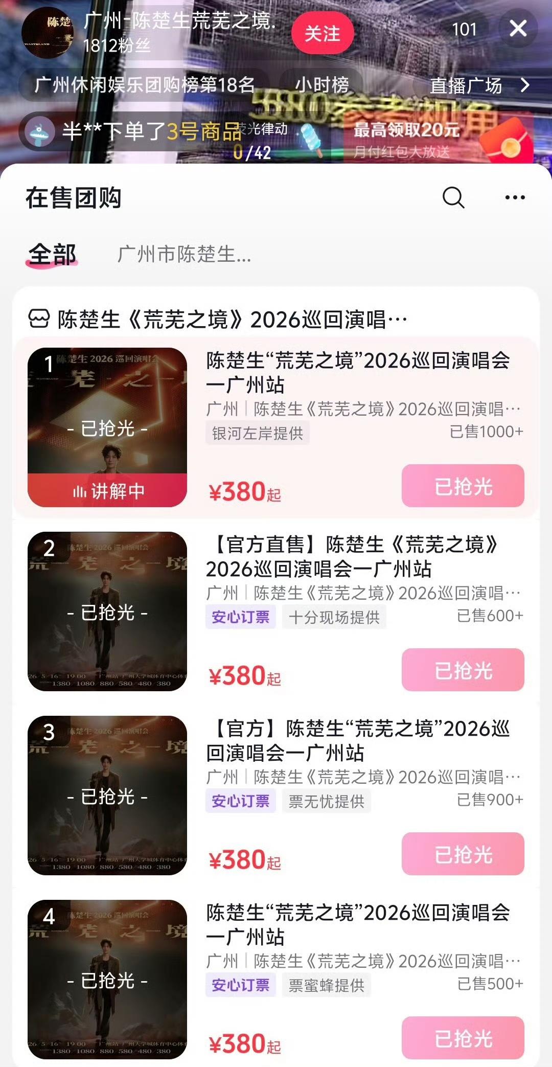 陈楚生抢票,广州场30秒售罄🔥。 一场比一场难抢,这路人盘和粉丝量真的太强了,仅30秒票就没了! 今天大麦开了24670张,抖音售卖3000多,近三万张票🎫全平台已售罄。 济南站我要铆足劲了。 生哥火的很稳啊。