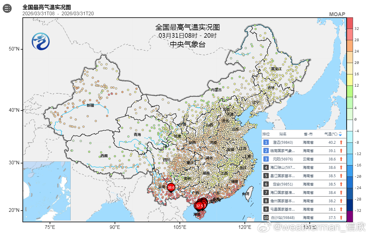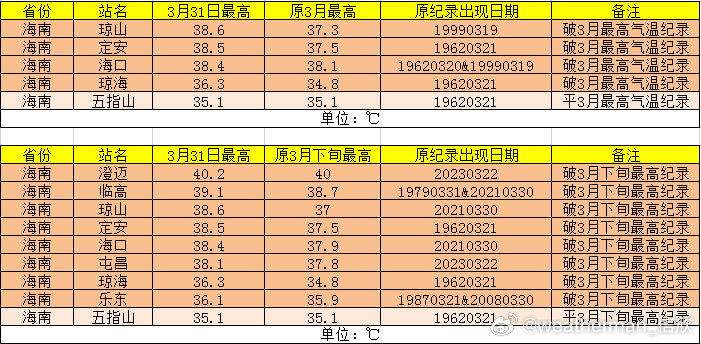 【气温】今天海南站点占据了高温榜前十中的九个席位,澄迈40.2℃,成为今年我国首个上40℃的国家气象站。包括澄迈在内,今天海南有7个站点打破3月下旬最高气温纪录,其中有4站打破3月最高气温,比如琼山38.6℃、定安38.5℃、海就38.4℃、琼海36.3℃。琼海也是首次在3月出现高温(但不是最早的高温,1979年2月24日有过35℃,为最早高温日)。