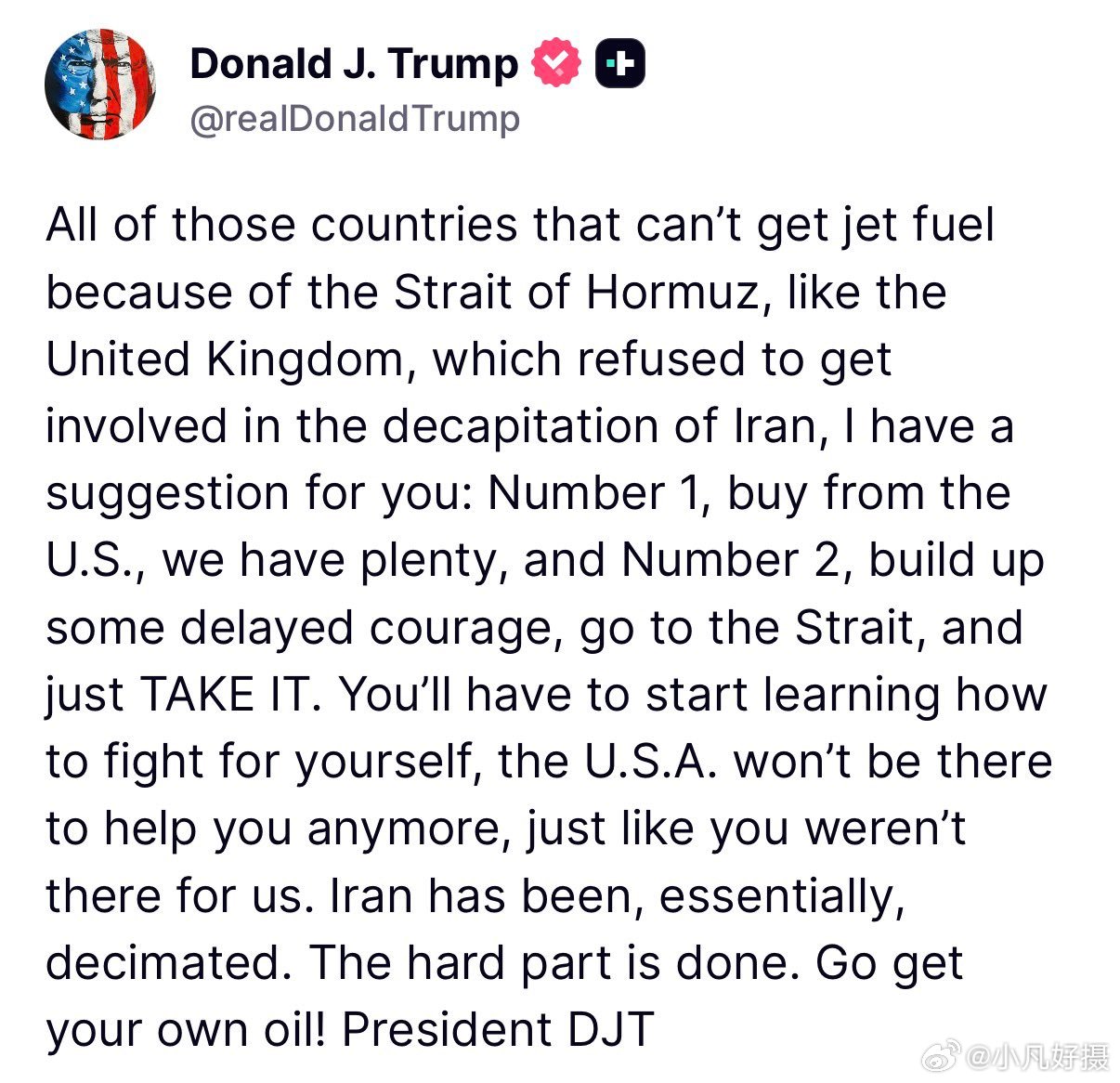 特朗普似乎气炸了!他今晚发文批评多国,并提供了建议:一是向美国买油,二是“拿出你们那迟来的勇气,闯进海峡,直接去抢吧(just TAKE IT)。”美伊以冲突海外新鲜事黄媒不会说的真相