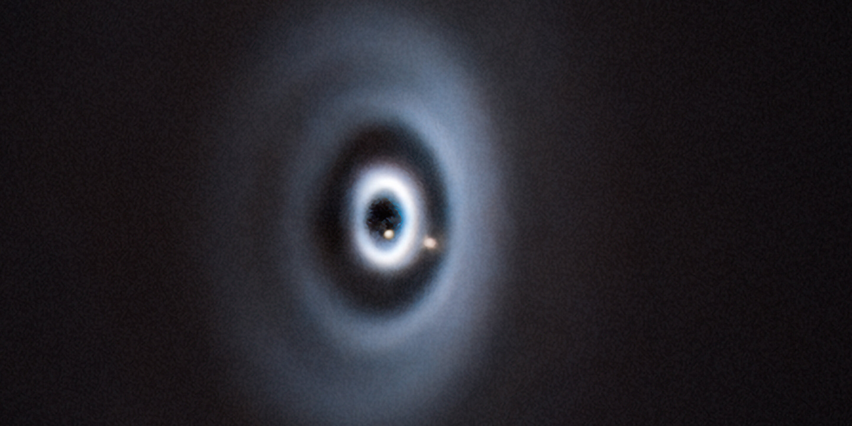 图为年轻恒星 WISPIT 2 周围的原行星盘,有两颗行星(浅褐色圆点)正在其中诞生。太阳系刚形成时,可能就是这副模样。图源:ESO / C. Lawlor, R. F. van Capelleveen et al.