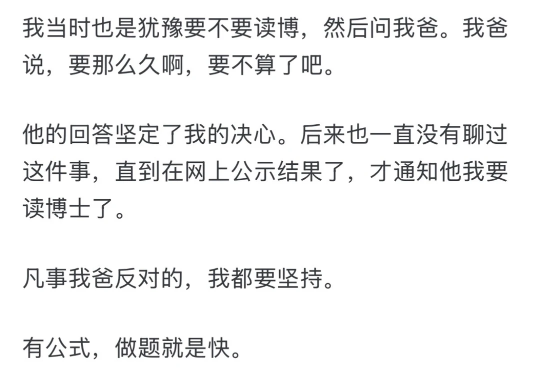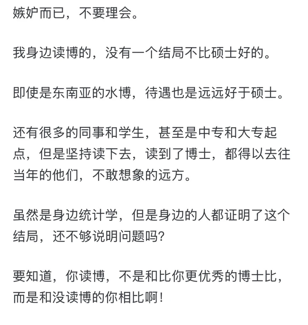 嫉妒而已,不要理会。 我身边读博的,没有一个结局不比硕士好的。 即使是东南亚的水博,待遇也是远远好于硕士。 还有很多的同事和学生,甚至是中专和大专起点,但是坚持读下去,读到了博士,都得以去往当年的他们,不敢想象的远方。 虽然是身边统计学,但是身边的人都证明了这个结局,还不够说明问题吗? 要知道,你读博,不是和比你更优秀的博士比,而是和没读博的你相比啊!