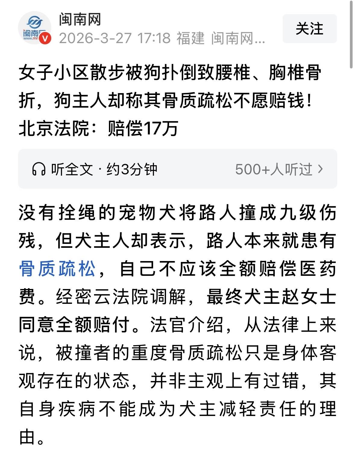 北京,女子在路上走得好好的,突然被一只没拴绳的狗撞到在地,送医院一查,腰椎和胸椎全骨折,构成9级伤残,狗主人一开始说会负全责,可得知治疗费17万后,立马变脸,说女子本身有重度骨质疏松症,自己不应该全额赔。双方闹上法庭,结局精彩了! 那天傍晚,张女士像往常一样在家附近的小路遛弯,刚走到一个临街院落门口,突然有个棕白相间的影子猛地窜出来。 那是只没拴绳的史宾格犬。那狗跑得太急,直接撞在了张女士腿上,她没站稳,结结实实摔在了水泥地上。 当时只觉得腰和背钻心地疼,站都站不起来,路过的邻居赶紧帮忙喊来她的家人。 送到医院一检查,张女士腰椎和胸椎都骨折了,全身还有多处软组织挫伤。 接下来的几个月,她躺在床上不能动,吃喝拉撒都得家人照顾,光是手术费和护理费就花了好几万。 好不容易能下床了,去做伤残鉴定,结果是九级伤残,这意味着往后干重活肯定不行了,连弯腰做家务都得小心翼翼。 一开始,狗主人赵女士还挺积极,主动垫付了一部分医药费,说都是自家狗的错,肯定会负责。 可等张女士把所有费用清单列出来,算下来总共要赔17万的时候,赵女士变脸了。 她托人打听,知道张女士之前就有重度骨质疏松症,就抓住这点不放,说要是换成正常人,被狗撞一下顶多摔个屁股蹲儿,哪能骨折这么严重,这伤残里有一大半是张女士自己的病导致的,她不该全额赔偿。 张女士气得直哭,自己好好走路上,没招谁没惹谁,被狗撞了不说,还要因为老毛病背锅? 她越想越不甘心,干脆把赵女士告上了法院。 开庭的时候,赵女士还拿出了张女士之前的病历,一口咬定是骨质疏松加重了伤情,要求少赔一半钱。 法官特意找了鉴定机构问情况,专家说,重度骨质疏松是老年人常见的身体状态,不是张女士能控制的,她走路没违规,也没主动去逗狗,完全没有过错。 就算她骨头结实,被没拴绳的狗突然撞上,也难保不受伤,自身疾病不能成为狗主人减轻责任的理由。 后来法院组织了调解。 根据《民法典》第1245条规定:饲养的动物造成他人损害的,动物饲养人或者管理人应当承担侵权责任;但是,能够证明损害是因被侵权人故意或者重大过失造成的,可以减轻责任。 赵女士饲养的犬只未拴绳且冲撞张女士,导致其九级伤残,赵女士作为饲养人应承担无过错责任。 赵女士提出的“张女士患有重度骨质疏松”这一理由并不成立。 法律视身体健康状况为客观状态,并非主观过错,受害人的体质差异不能成为侵权人减免责任的法定事由。 除非能证明张女士故意逗狗或存在重大过失,否则赵女士必须全额赔偿。 张女士既没逗狗也没跑,完全是受害者,赵女士没拴绳才是事故的根本原因,必须全额赔偿。 可能是听法官说清楚了利害关系,赵女士终于松了口,同意一次性赔17万,鉴定费也由她出,案件受理费张女士自己承担。 签调解书那天,赵女士当场就转了钱,还跟张女士道了歉,说之前是自己钻了牛角尖,不该拿人家的老毛病说事儿。 拿到赔偿款的那天,张女士拉着法官的手连声道谢。这大半年来,她既要养伤又要操心官司,整个人瘦了十几斤。 她表示:我自己有病是没错,但不能因为这个,就活该被狗撞了还得不到应有的赔偿呀! 对比,你怎么看? 关注@运良说法 学法律知识不迷路