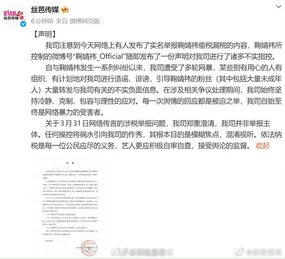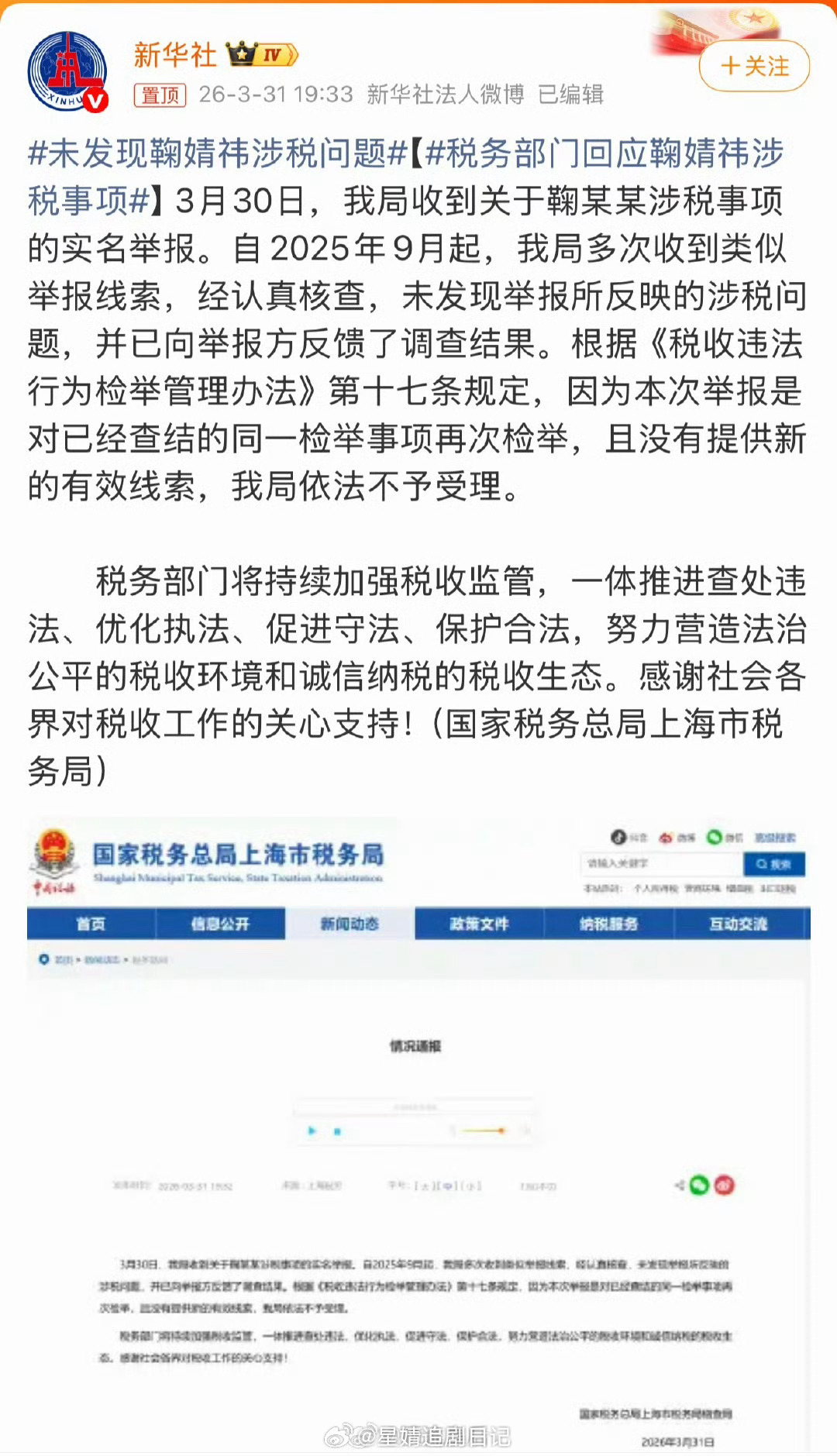 未发现鞠婧祎涉税问题 丝芭说举报鞠婧祎的主体并非他们,指责相关操作是嫁祸甩锅、混淆视听。丝芭三问鞠婧祎…我之前还担心🍊这事感觉公司还是有点料的,就怕影响剧~还好税务局回应来了,未发现举报所反映的涉税问题她是被造谣的。鞠婧祎光明磊落,经得起核查,经得起检验!讲真从去年9月就开始反复举报说明有人处心积虑设计良久,小鞠一路走来真的不容易!太牛了 橘姐这次真的完全算被置之死地而后生 被恶意举报要么举报者进去要么就是自己404吧。。丝芭好歹毒 鞠婧祎 此身分明了看来郭敬明今晚终于能睡着了🌚谁还记得他之前半夜一夜不睡在微博不停上线。鞠婧祎万花世界明天定妆,好消息一个接一个,小鞠继续走属于自己的星光大道 鞠婧祎走出自己的万花世界