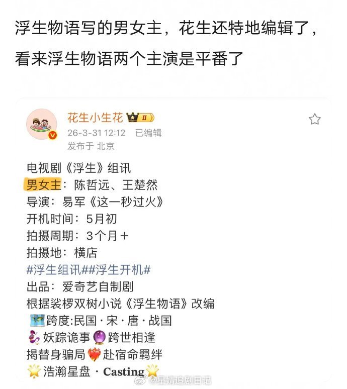 网友说《浮生物语》王楚然陈哲远平番,因为真瓜主发组讯时特地编辑了,把主演改成男女主,平番剧他都会写男女主。如果按姓氏笔画,王楚然在前。。。