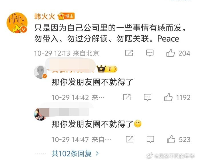 韩火火表示不喜欢传播负能量的人,建议关注每件小事。疑似支持周雨彤,但被评论区网友要求转告周雨彤。