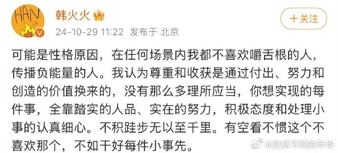韩火火表示不喜欢传播负能量的人,建议关注每件小事。疑似支持周雨彤,但被评论区网友