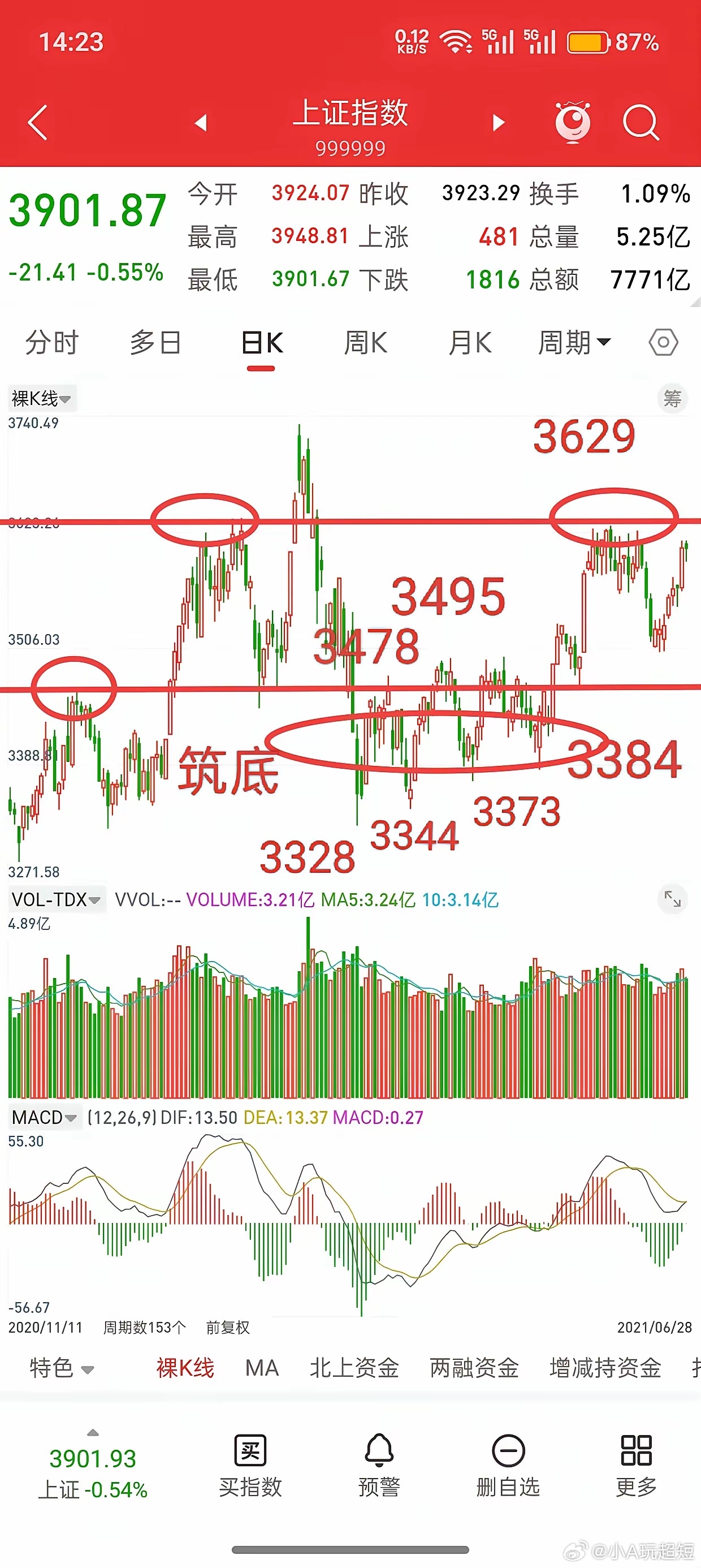 A股,今日冲高回落,是机会还是风险,后市走势会如何演绎?给大家看下,一个很有意思的数据,2021年那波走势,从3731一路下跌至3328,跌幅403点,第一波反弹到3478,反弹空间150点,后面又二次调整,最低点到3344,跌幅134点,第二波反弹到3495,反弹空间151点,最终筑底结束,反弹一波,最高点3629,从3328-3629最终是301点。那一波筑底,低点分别是3328-3344-3373-3384,低点一个比一个高。而这波从4797一路下跌至3794,跌幅403点,第一波反弹到今天为止3948,第一波反弹空间154点。如果筑底结束,最终如果也有300点左右涨幅,3794+300=4094。但是期间,如果回调,拉升,回调,拉升,但低点会上移,那接下来该如何做?而且大级别区间里面,如果也有小级别反复,那又该怎么做?所以,做好这个预期,心里就会踏实,因为到目前为止,行情走势都符合我的预期,如果没有这个预期,这一波行情下来,大概会淘汰很多人的,这就是市场, 也是人性。