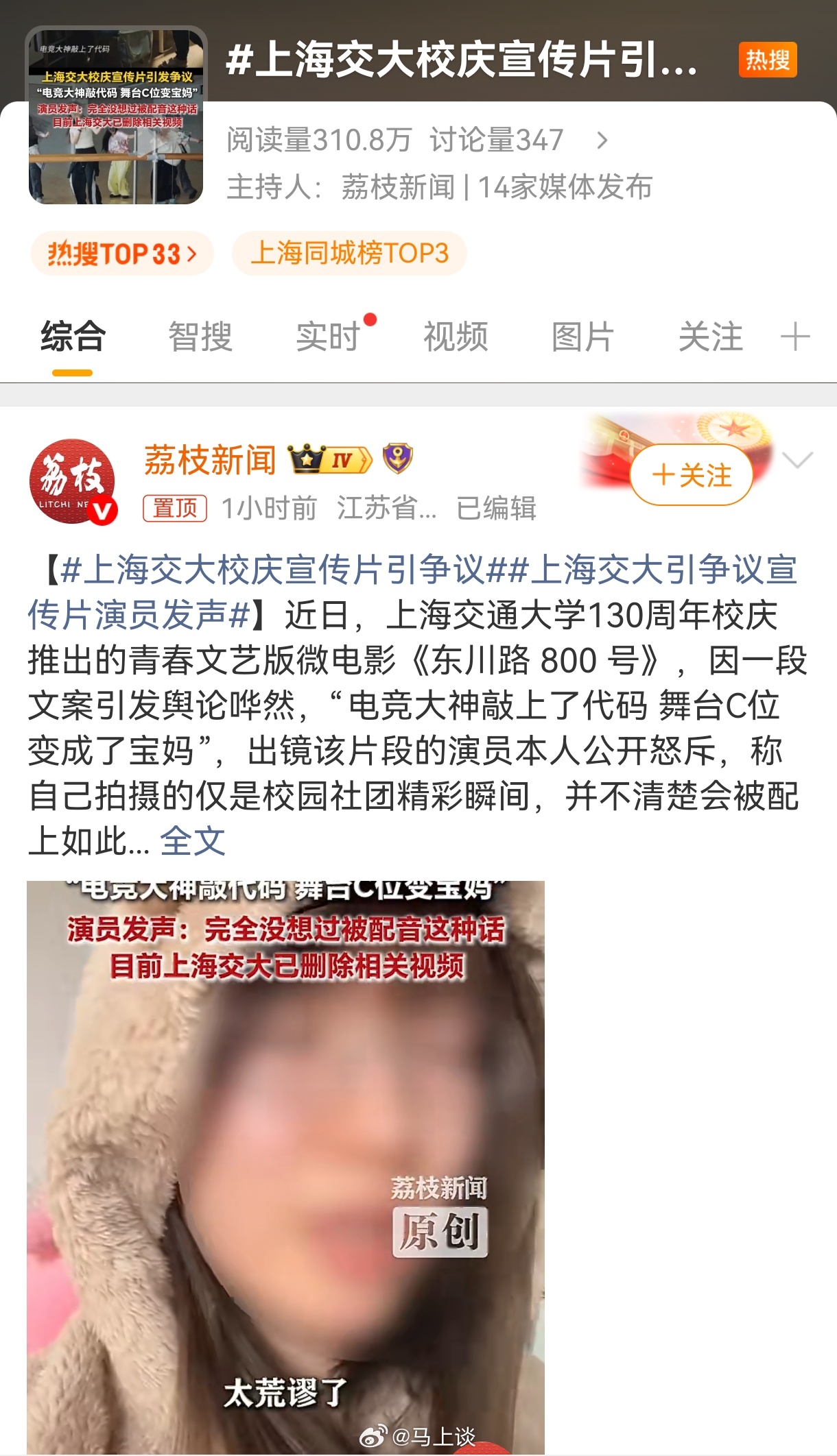上海交大校庆宣传片引争议 一句“电竞大神敲上了代码,舞台C位变成了宝妈”,毕业成家生娃,成为“宝妈”这有什么问题?值得如此兴师动众声讨吗?