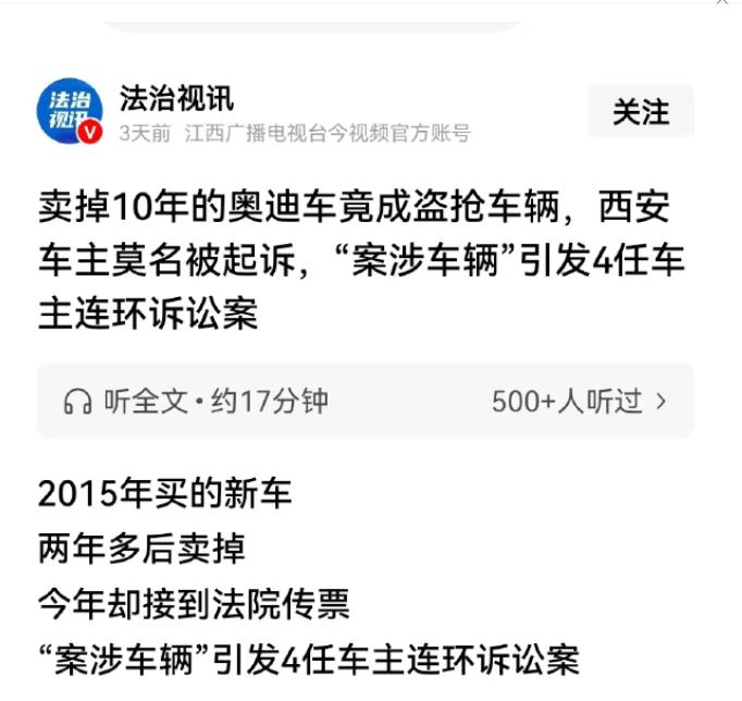 陕西西安,陈先生11年前花190000元买了一辆奥迪,两年后卖给了二手车行,2026年1月初,陈先生突然接到了一张传票,称他当年那辆车是偷的,还把他的账户冻结了。陈先生气坏了:我在4S店提的新车,怎么可能是偷的? 人在家中坐,祸从天上来。 今年1月刚开年,西安的陈先生连个反应的时间都没有,银行卡直接被法院给冻结了。紧接着就是一张冷冰冰的传票,硬生生把他拽进了一桩十一年前的旧事里。 传票上白纸黑字写着,他卷进了一起倒卖被盗车辆的大案。陈先生揉了半天眼睛,看着上面那串熟得不能再熟的车架号,只觉得荒唐得没边了。这明明是他当年花了真金白银提的新车啊! 咱们把时间往前倒。2015年5月那会儿,陈先生三十九岁,正值壮年。他跑到4S店里,全款刷了十九万,提了一台崭新的奥迪。选车、交钱、拿钥匙,再去车管所挂牌,整个流程干净利落,全在阳光底下,没半点见不得人的猫腻。 这车他开了两年半,平时真跟护眼珠子似的护着。到了2017年12月,他寻思着换个车开开,就把这台奥迪转手给了一家二手车行。当时的交易协议签得明明白白,各项手续本本也都交接得清清楚楚。 按理说,这事儿到这儿就算是和平分手,体面结束了。谁能想到,这其实是个埋在地下闷烧了九年的雷。 事情是这样的。天津有个姓于的大哥,今年初开着这车去车管所排队年检。结果呢,电脑系统死活就是不给过。还没等他弄明白怎么回事,警察就闻风过来了。 人家一核对发动机号和车架号,脸色铁青地告诉他:别费劲查了,你手里这台铁疙瘩是个贼赃,几千公里外的云南那边早就立案了。涉案车辆当场被强行扣留。 车子转手就被归还给了云南昭通的那个“原车主”。于大哥这下彻底急眼了,自己掏了十五万多买的豪车,瞬间连个铁皮都没剩下。他咽不下这口恶气,扭头就把当初卖他车的公司给告上了法庭。 这公司一接传票也毛了,立马掉头咬自己的上家。上家接了盘再去反咬上上家。这案子扯得就像个永远剥不完的俄罗斯套娃,中间过了赵某、荆某、甘某好几道手。这把滔天野火,最后就这么活生生地烧到了最源头的陈先生眉毛上。 听完这段魔幻的前因后果,陈先生气得心脏直抽抽。这简直是把人的智商按在地上疯狂摩擦。 咱们根本不用看别的,就死死盯住这案子里最扯淡的一个死结——时间线完全对不上啊! 云南那位丢车的王先生,去公安局报案的时间是2017年7月。当时当地警方就立案了,把这辆车的失踪信息甩进了全国联网的库里。 可是大家别忘了,陈先生刷卡买这台新车,是在2015年5月!人家在西安的大马路上堂堂正正地开了两年多,云南那边的同号车才宣告“离奇失踪”。买车在先,丢车在后。 难不成偷车贼手里还有个哆啦A梦的时光机,能大摇大摆穿梭回去,把两年后的车提前给顺走?这不纯纯的睁眼说瞎话嘛。这压根就不是什么倒卖贼车的天方夜谭,这就是一出极其卑劣的套牌克隆惨剧。两辆天南海北八竿子打不着的车,硬是被套上了同一张身份证。 退一万步把话说透了,就算这车骨子里真有点什么毛病,法律的板子也绝对不该打在一个普通消费者的屁股上。 陈先生当年是在灯光锃亮的4S店里爽快买的单,走了最严格合法的审批手续。这在法律条文里叫作绝对的“善意取得”。人家是个完全不知情的无辜老实人,没有任何主观作恶的嫌疑。 他又没开天眼,哪来的义务去查证几千公里外跨省的犯罪网络?真要狠狠追责,你去找那个隐形造假套牌的源头啊,或者去拍当年大门敞开收钱的4S店的桌子要个说法啊。 怎么颠倒黑白,也轮不到让一个老老实实守法过日子的公民倾家荡产来填这个大坑。 不过,最让人觉得后脊梁发凉的,还真不是原告这套胡搅蛮缠,而是咱们那个到处漏着大风的审核把关系统。 你想啊,2017年7月,这台车的身份密码就已经躺在失窃黑名单里了。 按理说这该高度敏感了吧?可偏偏在当年12月,陈先生卖车的时候,依然毫不费力地顺利办完了过户手续。系统安静得很,连个红灯都没跳出来拦一下。 更离谱的是,在接下来的几年时光里,这辆车又经历了至少三次跨省的倒手转卖。陕西、云南、天津,每一次交易理论上都要重新核验,可每一次它都在系统的眼皮子底下大摇大摆地“闯红灯”。所有的预警防线,全都像个睁眼瞎。 直到今年天津的于大哥去审车,这庞大的防御系统才像个刚睡醒的醉汉一样,猛地拉响了刺耳的警报。可这份迟到了将近九个年头的正义,已经把好几个完全无辜的家庭死死拖进了不见天日的泥潭。 在这场横跨三省的荒诞大戏里,真正隐于暗处的黑手早就玩了出金蝉脱壳。剩下的,就是一地满眼血丝、被诉讼锁死的受害者们,在互相撕咬。 现在,被卡住喉咙的陈先生依然在四处奔走。