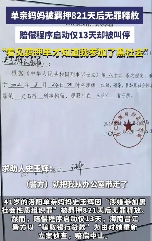 海南,41岁单亲妈妈因为涉嫌参加黑社会被羁押了821天,后来,检察院认定证据不足