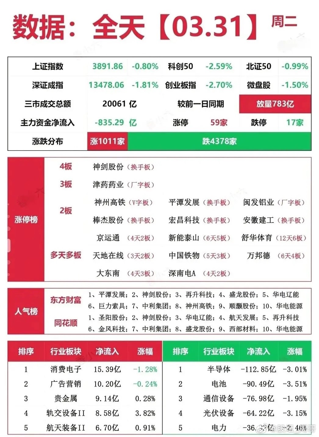 3月31日A股市场呈现出分化博弈的态势,三大指数集体走弱,市场整体情绪略显低迷。