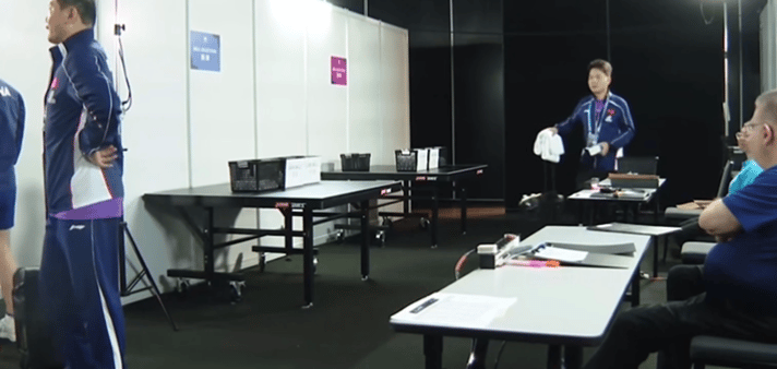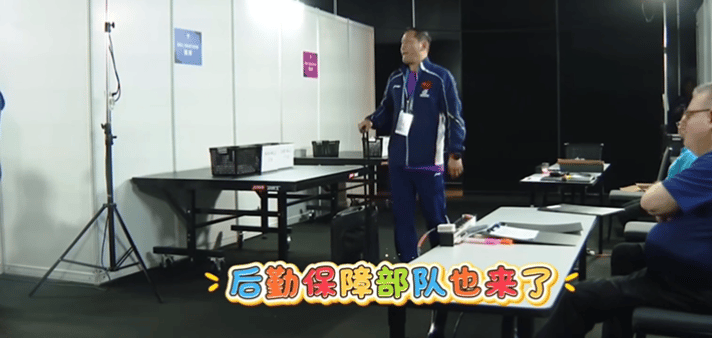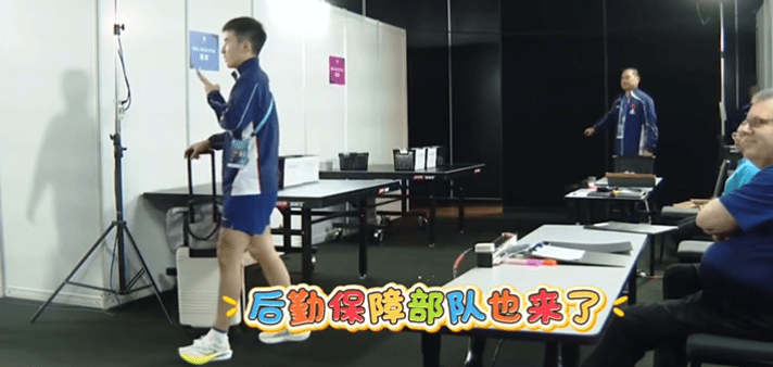 王楚钦比赛,5个人一起陪他进入,工作人员都看笑了, 中国队的配置绝对是最好的。 今天是澳门世界杯王楚钦的第一场比赛, 比赛开始前, 王皓先推着王楚钦的行李箱快速的在另外通道进入赛场, 到场外教练席等待。 然后是孙逊教练,中间是楚钦, 后面是陪练小牛, 然后是杨先军体能教练, 最后是队医,手里还拿着一包抽纸。 旁边的工作人员都看呆了, 头在随着人群转动,一脸的笑意, 这配置,他们也是羡慕的吧。