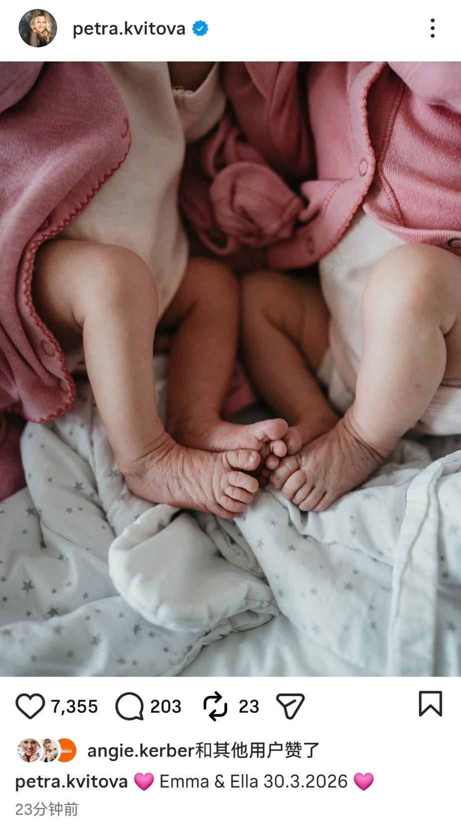 科维托娃和丈夫再添一对双胞胎!捷克名将在2024年生下儿子Petr,如今又迎来了女儿Emma和Ella🩷