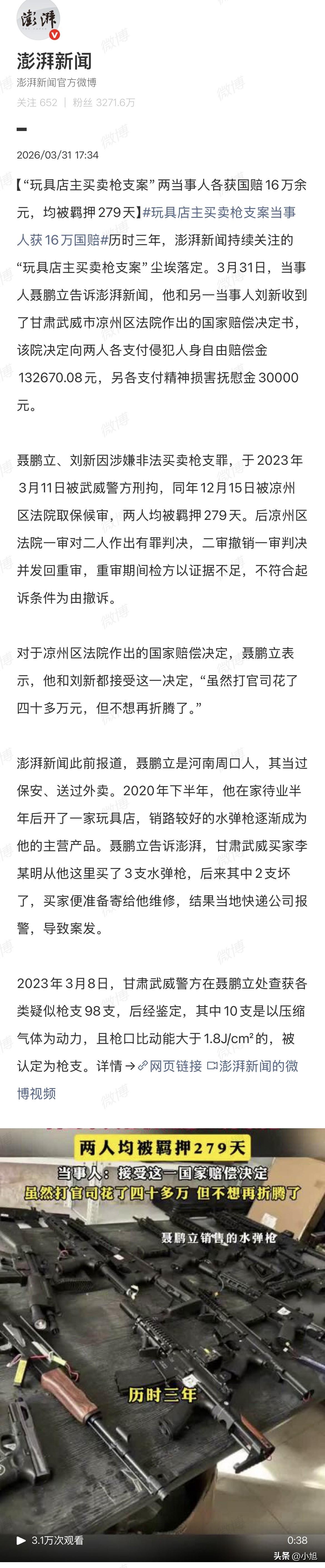 3月31号,甘肃那个卖水弹枪被判刑的玩具店主聂鹏立,终于拿到国家赔偿了。16万多,他和另一个伙计刘新,一人一份。 但这事儿,远远不止16万那么简单。 先说说这16万是怎么来的。法院算了279天,一天475.52块,加起来13万2千多。外加3万块精神抚慰金。聂鹏立拿到这个决定书的时候,说了一句话:“虽然打官司花了四十多万,但不想再折腾了。” 打官司花了四十多万,赔到手16万,这里外里的账,谁都会算。 但聂鹏立说“不想再折腾了”,这句话才最扎心。三年了,从2023年3月被抓进去,到现在拿到赔偿决定书,整整三年。他是河南周口人,以前当过保安、送过外卖,2020年下半年才开了这家玩具店,卖水弹枪。 他开店的时候肯定没想到,卖玩具也能把自己卖进去。 事情是怎么起的?一个甘肃武威的买家叫李某明,从他店里买了三支水弹枪,玩坏了两支,寄回去让他修。结果当地快递公司一瞅,这啥东西?报警了。就这么一个修玩具的事儿,最后演变成了买卖枪支案。 2023年3月8号,武威警方在他那儿查获了98支水弹枪,最后鉴定出来10支是“枪”。鉴定标准是枪口比动能大于1.8焦耳每平方厘米。 这10支“枪”的数据,最高的2.464,最低的1.810。就比那个及格线高了一丁点。枪口比动能是什么概念?说白了就是打出去的东西有多大劲儿。水弹打出去碰到人身上就碎了,打到硬东西上也是一滩水。 但就是这个1.8的线,把聂鹏立和他身边的人全拖进去了。 2023年3月11号,聂鹏立和刘新被刑拘。除了他俩,聂鹏立的老婆,还有另外四个人,也都被刑拘过,只是那五个人后来没被批捕,取保了。一家六口人,因为卖水弹枪,全被折腾进去了。 一审2023年12月28号判的,聂鹏立判三缓四,刘新判二缓三。法院在判决里也提到,他们卖的是枪口比动能较低的枪,主观上也是当仿真枪在卖,水弹致伤力小,没造成严重后果,社会危害性小。但既然鉴定出来是枪,那就按相关法律来判。 聂鹏立不服,上诉了。 二审拖了快一年,2025年3月25号,武威中院裁定:一审部分事实不清、证据不足,发回重审。 重审的时候,2025年10月30号,检察院撤诉了。理由写得很直接:没法证明聂鹏立知道卖的是“枪”,而且涉案枪支能不能改装提升威力,也做不出鉴定。 看清楚没?从一开始的“非法买卖枪支罪”,到最后检察院撤诉的理由是“没法证明他知道那是枪”。 换句话说,你卖的是玩具还是枪,你自己都不知道。但你已经因为这事儿被关了279天,花了四十多万打官司,全家人被折腾了三年。 2025年12月26号,检察院正式下了不起诉决定书。聂鹏立和刘新去申请国家赔偿,要了26万多,包括赔礼道歉。法院最后给了16万多。 聂鹏立不争了。他说“不想再折腾了”。 这事儿看完,有两点值得琢磨: 一个是那个1.8焦耳的标准。2007年定的,2008年实施。你卖个玩具,可能就踩线了。线在哪里?普通老百姓根本不知道有这回事,等你进去了才知道有这么个标准。 另一个是,从买家寄回维修的玩具枪,到快递公司报警,到刑拘、起诉、一审有罪、二审发回、检方撤诉、国赔。三年时间,四十多万花费,一家六口被折腾,最后换来一句“证据不足,无法证明主观明知”。 这16万,能补回那279天吗? 你觉得这事儿,聂鹏立冤不冤?评论区说说你的看法。 (来源:澎湃新闻)