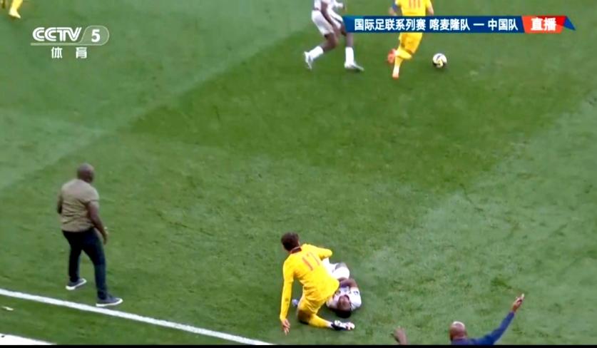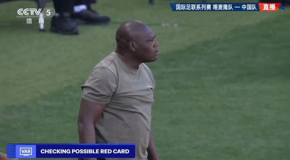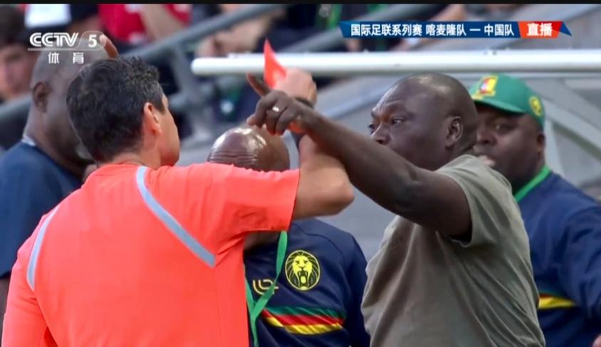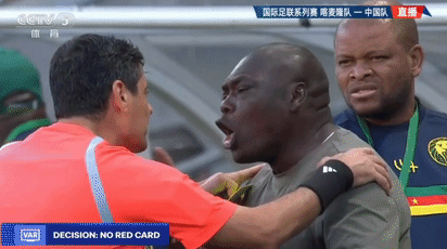主裁判劝喀麦隆主教练帕古冷静,都把手搭在了他的肩膀上,但帕古完全听不进去,自顾自地张大嘴叫,一脸怒气地比划着……也不知道说了些什么,主裁判直接摸出红牌,一亮,这下帕古也冷静了,场面一下安静了。 让帖古这么不冷静,是在比赛57分钟时(见图5),从慢动作回放看,拜合拉木这个动作非常干净,没有犯规,裁判判罚没有任何问题……而这一幕就发生在帕古眼前,从他的视角看,拜合拉木踢到球的动作正好被倒地球员遮挡了,因此帖古才会这么不冷静,指着裁判大吼大叫,还不时比划着脚踩人的动作。 不过,事后如果帕古看回放,也会觉得自己这张红牌遭得不冤。