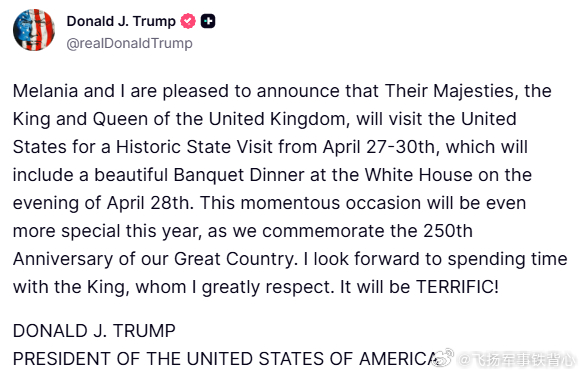梅拉尼娅和我很高兴宣布,英国国王陛下与王后陛下将于 4月27日至30日访问美国,进行一次历史性的国事访问,其中包括 4月28日晚在白宫举行的盛大国宴。