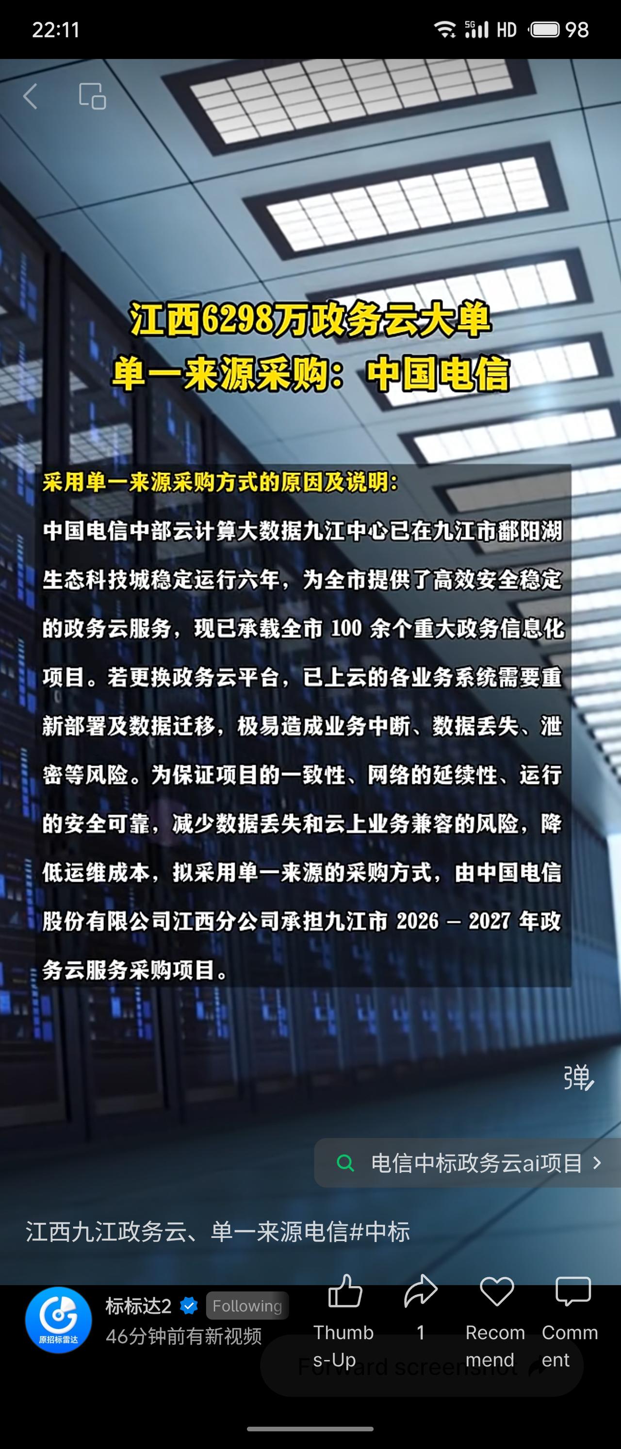江西九江发布2026-2027年政务云服务项目,预算6635万元,最终以6298万元单一来源采购中国电信。原因在于中国电信中部云计算九江中心已稳定运行六年,承载全市百余个政务项目,更换平台易导致业务中断、数据风险,为保证延续性与安全性,故采用单一来源方式。