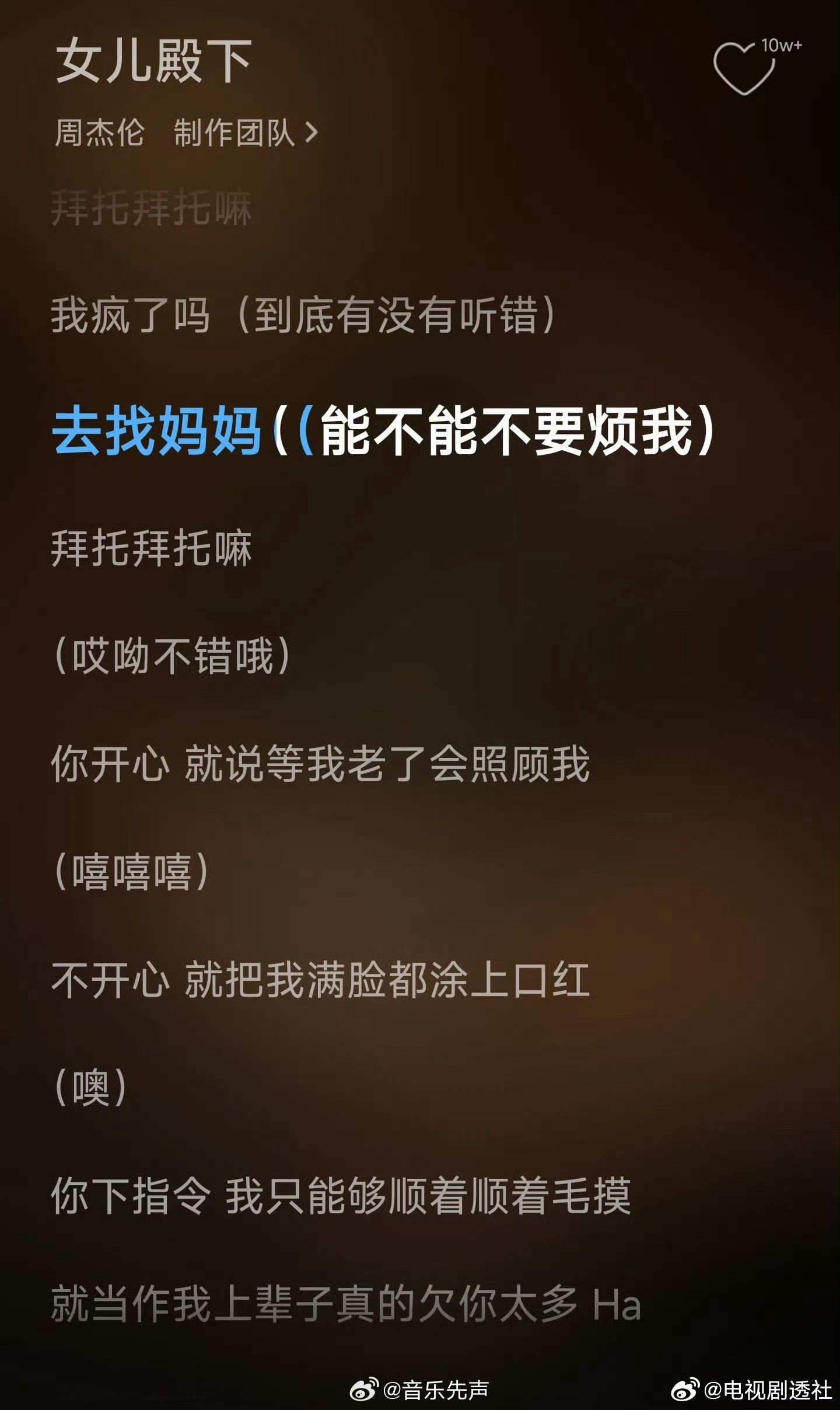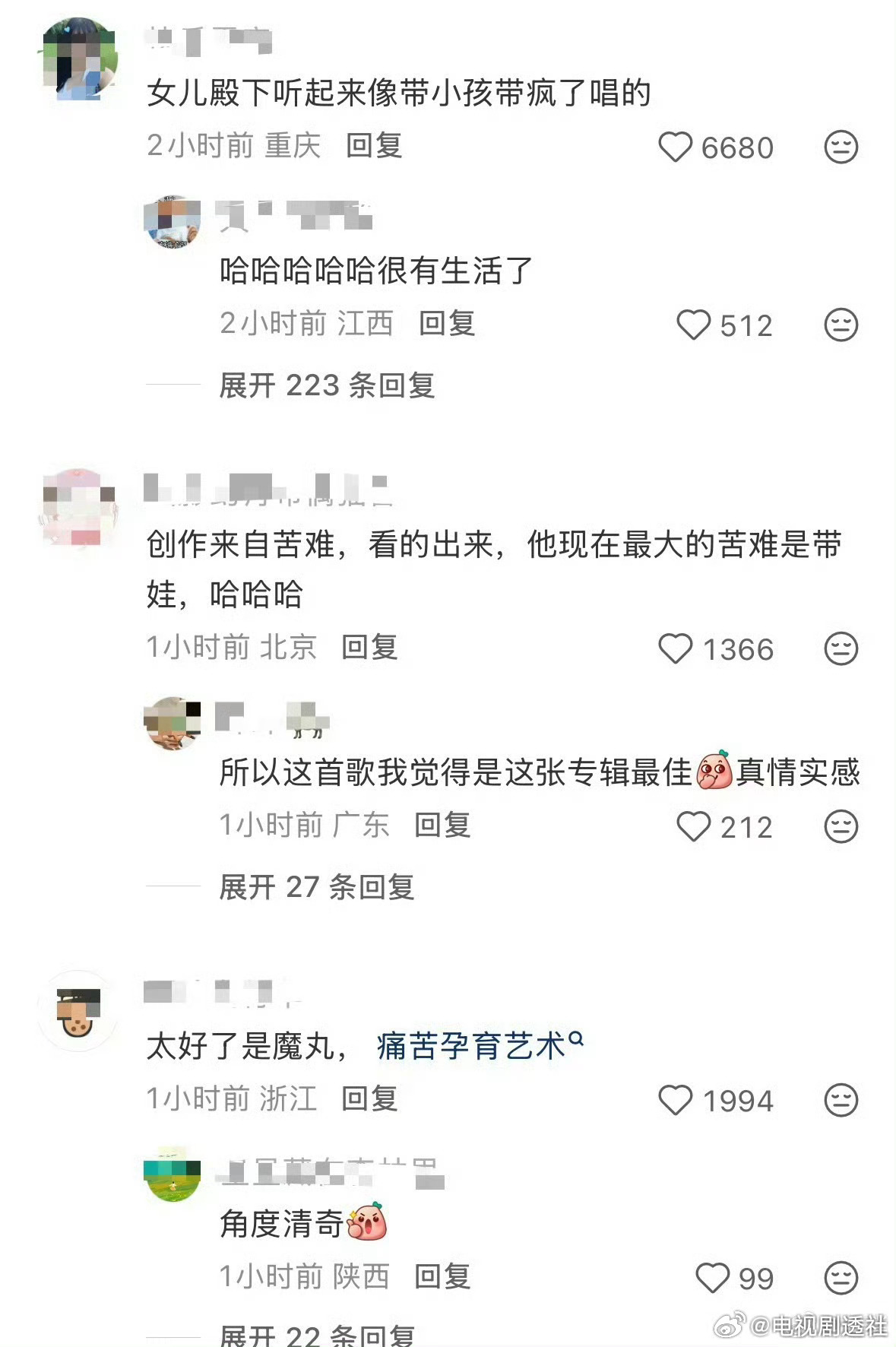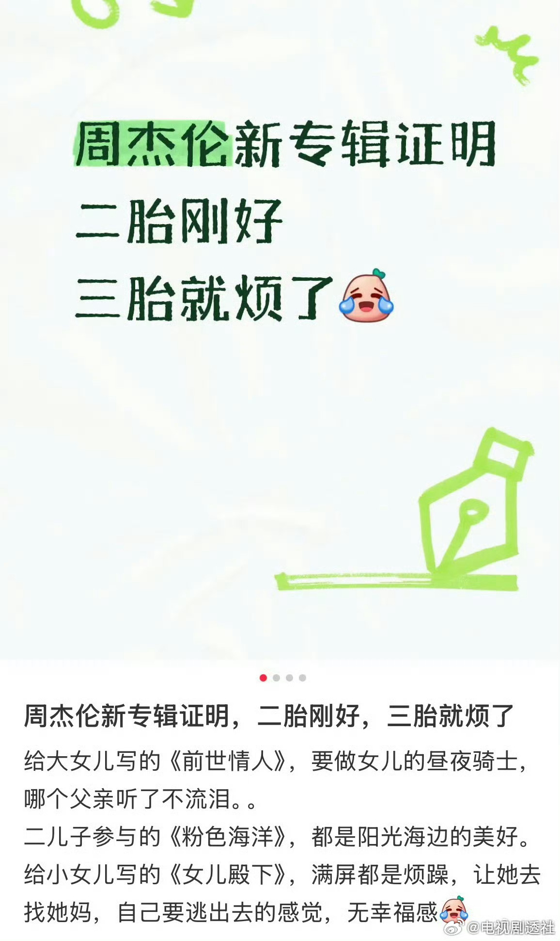 周杰伦新专辑 二胎刚好三胎就烦了给大女儿写的《前世情人》,要做女儿的昼夜骑士,哪个父亲听了不流泪。二儿子参与的《粉色海洋》,都是阳光海边的美好。给小女儿写的《女儿殿下》,满屏都是烦躁,让她去找她妈,自己要逃出去的感觉,无幸福感!