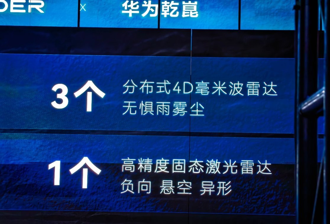 FREELANDER 神行者搭载一颗华为 896 线双光路图像级激光雷达、3 个分布式 4D 毫米波雷达、1 个高精度固态激光雷达、2 个 4D 毫米波角雷达、11 个高清摄像头、12 个超声波雷达。