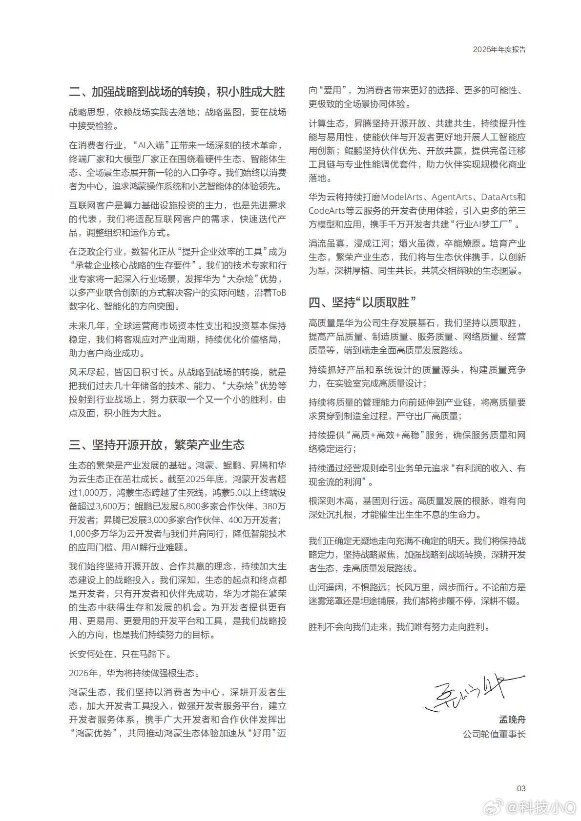 3月31日,孟晚舟在2025华为年报致辞中强调,生态的繁荣是产业发展的基础。孟晚舟称生态繁荣是产业发展基础 2026年,华为将持续做强根生态。截至2025年底,鸿蒙开发者超过1000万,鸿蒙5.0以上终端设备超过3600万;鲲鹏已发展6800多家合作伙伴、380万开发者;昇腾已发展3000多家合作伙伴、400万开发者;1000多万开发者与华为云一起,降低智能技术的应用门槛、用AI解行业难题。孟晚舟华为2025年报致辞