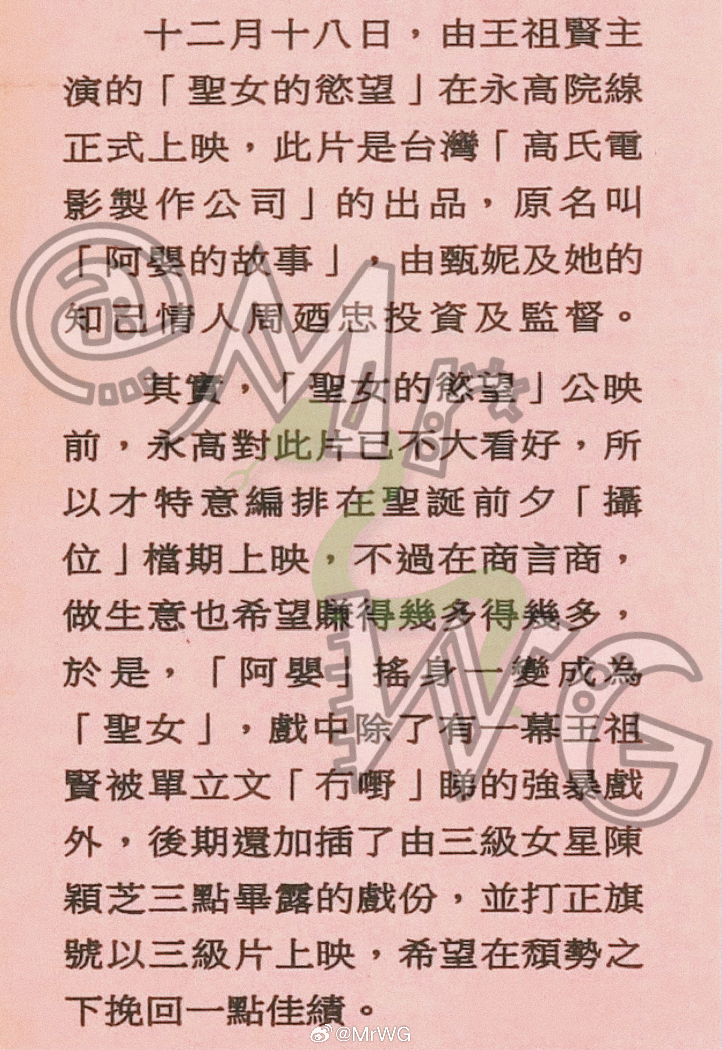 王祖贤独家扫描 1990拍竣,过江香港上映已经是三年后,其实当年就有杂志报道了王祖贤的【阿婴】❄️、被改名【圣女的欲望】💋的悲惨遭遇王祖贤 ——这套生不逢时的艺术片,为了市场而被一心只向钱看的片商,糟蹋成“不得见光”的限制🚫级,委实可惜!
