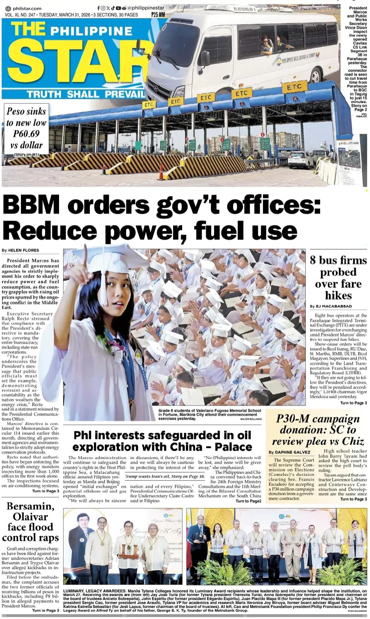 菲律宾政府要谋求与中国开发南海油气资源时,在南海区域上态度强硬。菲律宾政府真是“有困难找中国,没困难找美国”。 《菲律宾星报》头版报道称,菲律宾总统府:菲律宾在与中国的石油勘探中利益得到保障 。 菲律宾总统府马拉坎南宫一名官员向菲律宾民众保证,菲律宾与中国就潜在的海上石油和天然气勘探展开了“初步交流”,强调“没有(菲律宾的)利益会被忽视”。 她强调:“我们将始终真诚地保护菲律宾在西菲律宾海(南海)的权利,这关乎国家以及每一位菲律宾人的利益。” 马科斯政府在第24次外交部磋商以及双边磋商机制第11次会议上,就潜在的海上石油和天然气勘探展开了讨论(如果有讨论的话)。 菲律宾总统府通讯办公室副部长克莱尔·卡斯特罗用菲律宾语表示。 另外该报关注了,菲律宾总统小马科斯下令政府办公室:减少电力、燃料使用。 马科斯总统已指示所有政府机构严格执行他的命令,大幅降低电力和燃料消耗,因为该国正努力应对中东持续冲突引发的油价上涨问题。 菲律宾政府行政秘书拉尔夫·雷克托强调,必须遵守总统的指令,这适用于整个官僚体系,包括国有企业。 雷克托在总统通讯办公室发布的一份声明中说:“这项政策凸显了总统的信息,即公职人员必须树立榜样,在国家应对能源危机时展现出克制和责任感。” 马科斯的指令包含在本月早些时候发布的第114号备忘录通知中,指示所有政府机构和部门严格采用节能方案。 雷克托指出,当局已开始执行这项政策,仅在第一周,能源监测人员就检查了1000多个办公室。 检查重点是空调系统。