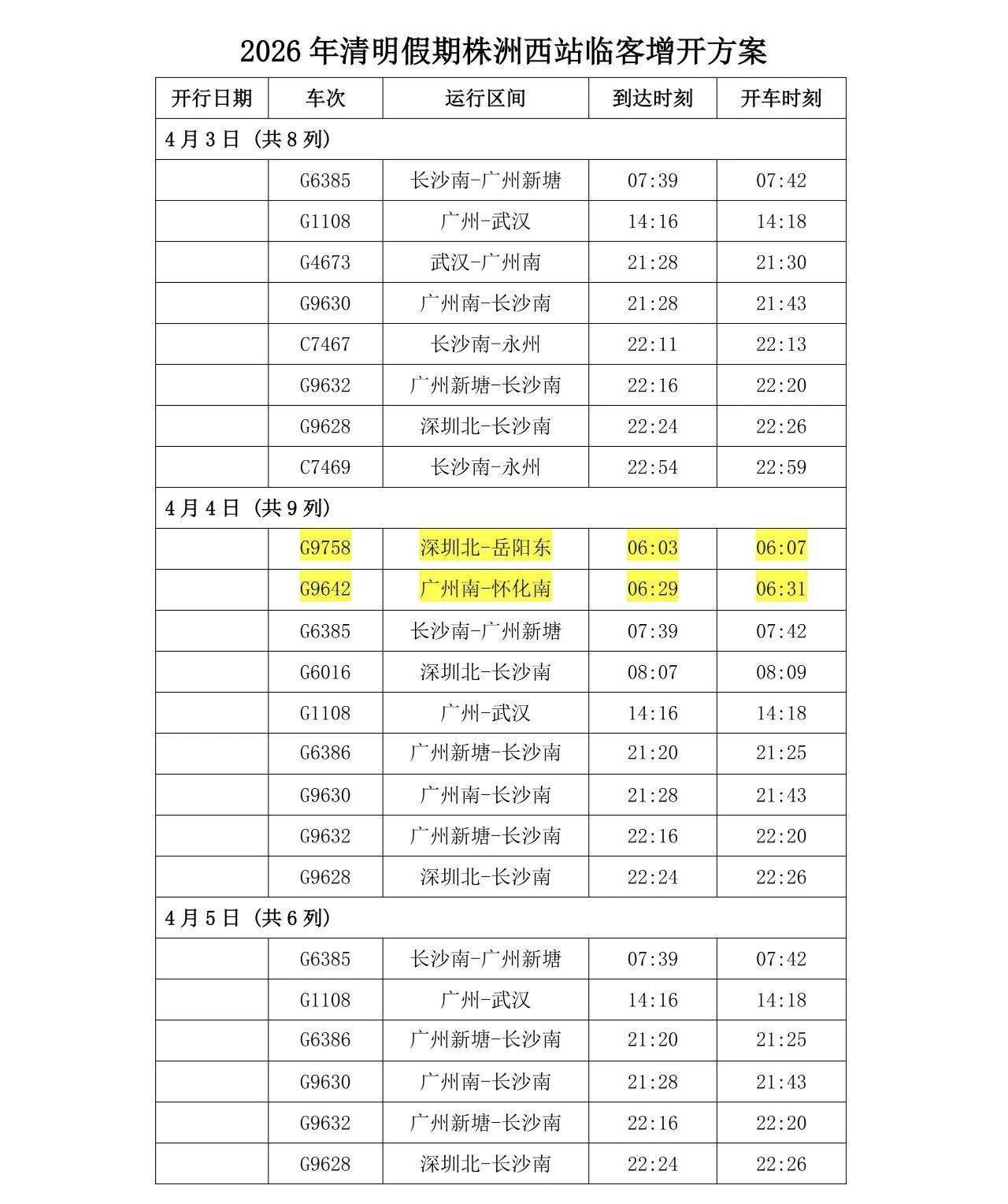 2026年清明假期株洲西站运力全面升级 计划加开37趟列车保障出行 2026年清明小长假临近,为充分满足旅客祭扫、踏青、短途出游等多元化出行需求,株洲西站精准部署假期运输保障方案,在4月3日至4月7日共计5天的铁路清明运输周期内,计划加开列车37趟,以充足的运力供给全力护航旅客假期出行安全、顺畅、有序。 今年清明假期法定放假时间为4月4日至6日,受春日短途出行需求集中释放、省内多地春假与清明假期衔接等因素影响,短途客流成为假期运输主力。据国铁广州局集团预测,本次清明运输周期内,广铁管内预计发送旅客超1200万人次,客流整体以短途扫墓、踏青流为主,旅游流为辅,呈现出“前期集中出行、增速较快,后期分散返程、较为平缓”的鲜明特点 。节前客流将形成以广州、深圳、长沙等中心城市为核心的放射性出行潮,重点向湘南、粤北、粤东等周边城镇扩散,节后返程客流则呈现多波次、分散化特征。 基于整体客流趋势,株洲西站提前开展大数据客流分析研判,预计本次假期客流最高峰将出现在4月4日,单日旅客发送量有望突破1.5万人次。为精准应对客流高峰,车站通过加开热门线路列车、动车组重联运行、增开夜间高铁等多种方式,全方位加大运力投放。此次计划加开的37趟列车中,包含3趟夜间高铁与1趟始发列车,重点覆盖长沙、广州、深圳等核心热门方向,精准匹配节前集中出行与节后分散返程的双向客流需求,最大限度保障旅客出行选择。 在强化铁路运力保障的同时,株洲西站同步完善旅客出行全链条服务衔接。针对临客及夜间高铁的开行特点,车站主动与地方公交、城管、出租车、网约车等相关部门与单位协调对接,建立客流协同保障机制。根据列车到发时刻与客流实时变化,动态调整城市公共交通运营方案,通过延长公交营运时间、加大线路开行密度、实时调度出租车辆等多项举措,实现铁路运输与城市公共交通的高效衔接,全力畅通旅客到达“最后一公里”。 随着春日文旅市场持续升温,清明假期人员流动规模持续扩大,铁路部门以精准的运力调配和完善的服务保障,既为广大旅客平安便捷出行筑牢基础,也为区域人员顺畅流动、文旅经济稳步复苏提供了坚实的交通支撑。铁路部门同时提醒广大旅客,假期列车开行具体信息可通过铁路12306官方渠道查询,建议合理规划行程,尽量选择错峰出行,出行期间配合做好各项安全管理工作,共同维护良好的出行环境。