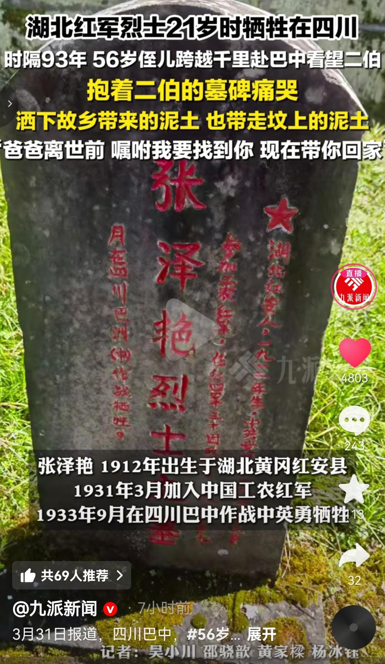 21岁红军烈士埋骨四川93年,56岁侄儿跨越千里抱碑痛哭:爸,我带二伯回家了! 93年的等待,三代人的执念,这才是刻在中国人骨子里的家国情怀! 事情发生在四川巴中。56岁的张先生,从湖北黄冈红安县千里迢迢赶来,只为了见一眼自己的二伯——红军烈士张泽艳。 张泽艳烈士,1912年出生,1931年参加红军,1933年9月在四川巴中作战时英勇牺牲,年仅21岁。从1933年到2026年,整整93年,这位年轻的烈士,一直长眠在离家千里的巴山蜀水间。 而这93年里,找二伯回家,成了张家三代人一辈子的执念。 张先生说,自己的奶奶,也就是张泽艳的母亲,1975年去世前,一直托付儿子、也就是张先生的父亲:“无论如何,一定要把你二哥找回来。” 2024年,张先生的父亲临终前,又把这个沉甸甸的嘱托,交到了自己儿子的手里:“爸爸这辈子没完成的事,你一定要找到你二伯,带他回家。” 带着父亲的遗愿,带着奶奶的期盼,张先生跨越千里,终于在四川巴中的烈士陵园里,找到了二伯张泽艳的墓碑。 当看到墓碑上“张泽艳”三个字的那一刻,这个56岁的汉子,再也绷不住了,抱着冰冷的墓碑,哭得撕心裂肺,一遍遍地喊着:“二伯,我来看你了!我带你回家!” 他从湖北老家带来了故乡的泥土,小心翼翼地洒在二伯的坟前,让烈士尝尝家乡的味道;又轻轻铲起坟上的一抔土,装进一个红色的小木盒里,要把这抔土带回湖北,就像把二伯的英灵,带回了阔别93年的家。 视频里,他跪在坟前,一遍遍地念叨着:“爸爸离世前嘱咐我要找到你,现在带你回家。”每一句话,都像刀子一样扎在人心里。 网友评论区直接破防,全是泪目! 有的网友说:红安是将军县,多少孩子为了家国,永远留在了异乡!这就是我们湖北人的血性!看哭了! 也有的网友说:欢迎烈士回家!巴中人民永远铭记您!您的后人来看您了! 还有的网友说:三代人,93年,就为了一句“带他回家”!这就是中国人的信仰!破防了! 更有的网友说:21岁啊!花一样的年纪,为了我们今天的好日子,牺牲在千里之外!向烈士致敬! 说实话,看完这个视频,眼泪止不住地流。 太多人说,现在的人忘了历史,忘了先烈。可看看这个视频,你就知道,刻在中国人骨子里的家国情怀,从来都没有断过! 21岁的张泽艳,本该在家乡孝敬父母,娶妻生子,过着安稳的小日子。可他为了国家,为了民族,毅然选择参军,最终把年轻的生命,永远定格在了21岁,永远留在了千里之外的四川。 而他的家人,用了整整93年,三代人的接力,只为了完成一个承诺:带他回家。 这是什么?这就是信仰!这就是传承!这就是我们中华民族生生不息的根! 有人说,这只是一个普通的寻亲故事。可我要说,这根本不是普通的故事!这是一个民族对英雄的铭记,是一个家族对信仰的坚守! 我们今天能安安稳稳地吃着火锅,刷着手机,过着太平日子,不是凭空来的,是无数像张泽艳这样的年轻烈士,用生命换来的! 他们把生命留在了战场上,而他们的家人,用一辈子的时间,去寻找他们,去接他们回家。这就是我们中国人,最朴素也最伟大的情感! 93年过去了,山河已无恙,英雄终回家。 张泽艳烈士,您看到了吗?您的后人,跨越千里,来接您回家了!您的牺牲,我们永远铭记!您的英灵,永远安息! 山河无恙,英雄回家;三代执念,从未忘家!这就是中国人刻在骨子里的家国信仰,永远不会断!