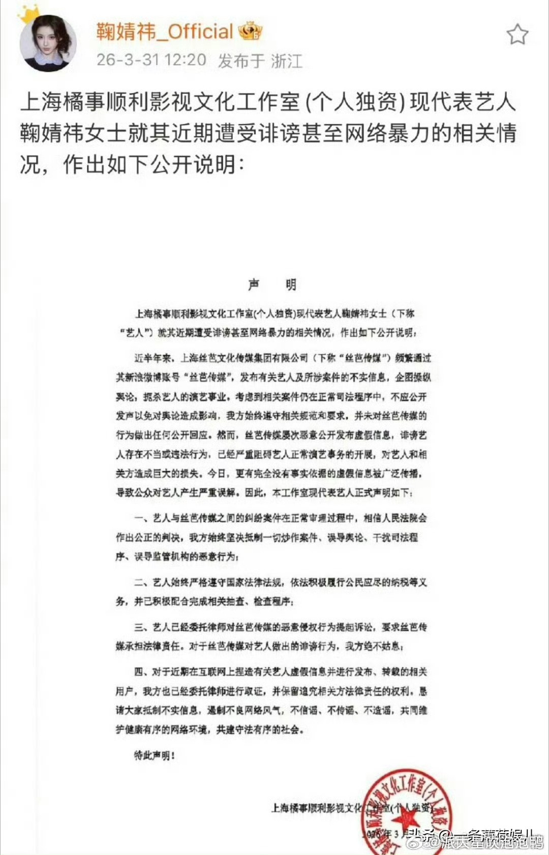 鞠婧祎工作室发了声明,硬刚丝芭诽谤。不管四千年会不会成为素人,这个丝芭传媒有多可