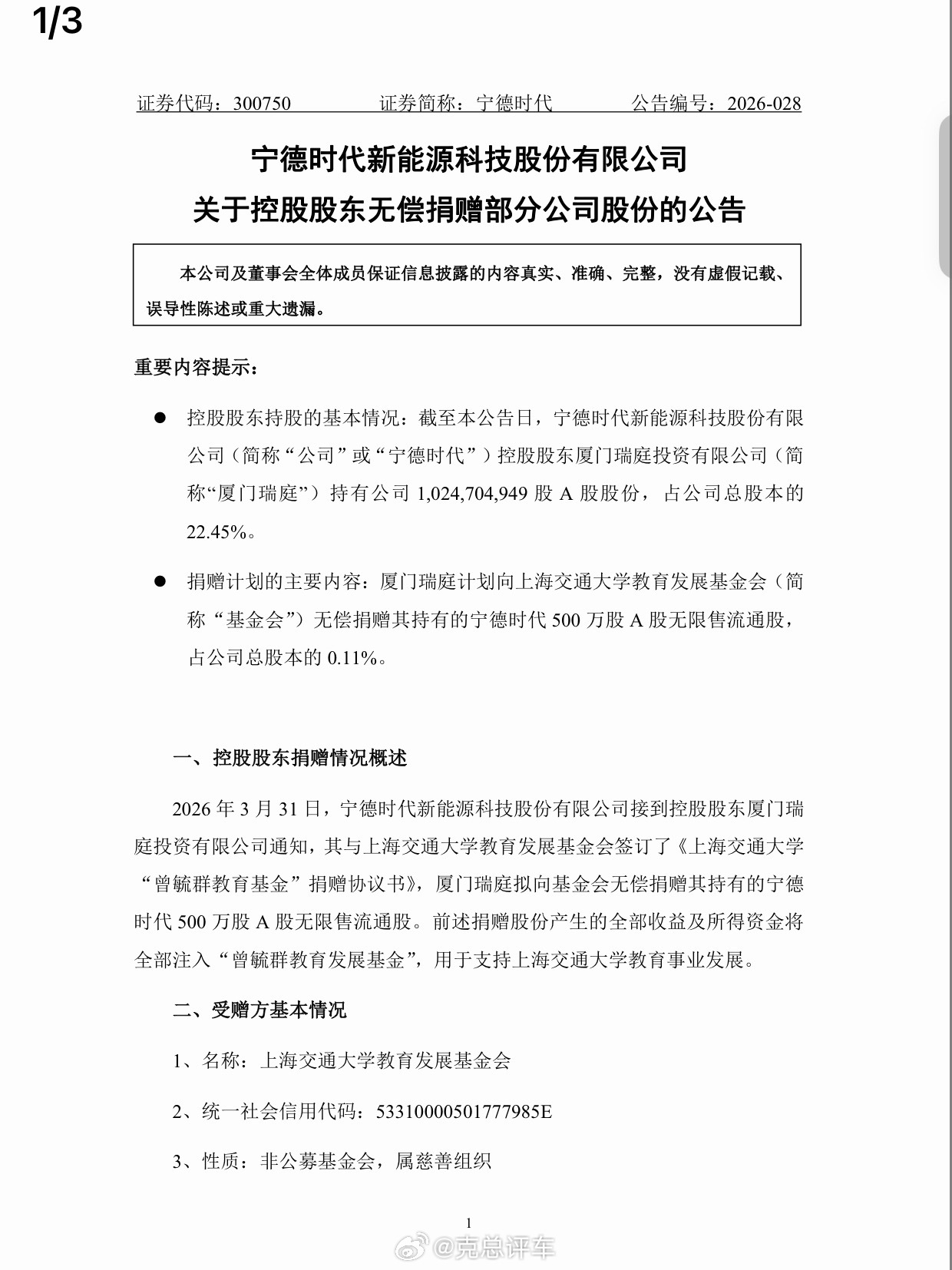 3月31日,宁德时代发布公告,公司董事长曾毓群向上海交通大学教育发展基金会捐赠其个人持有的公司A股500万股股票,用于支持教育事业发展。