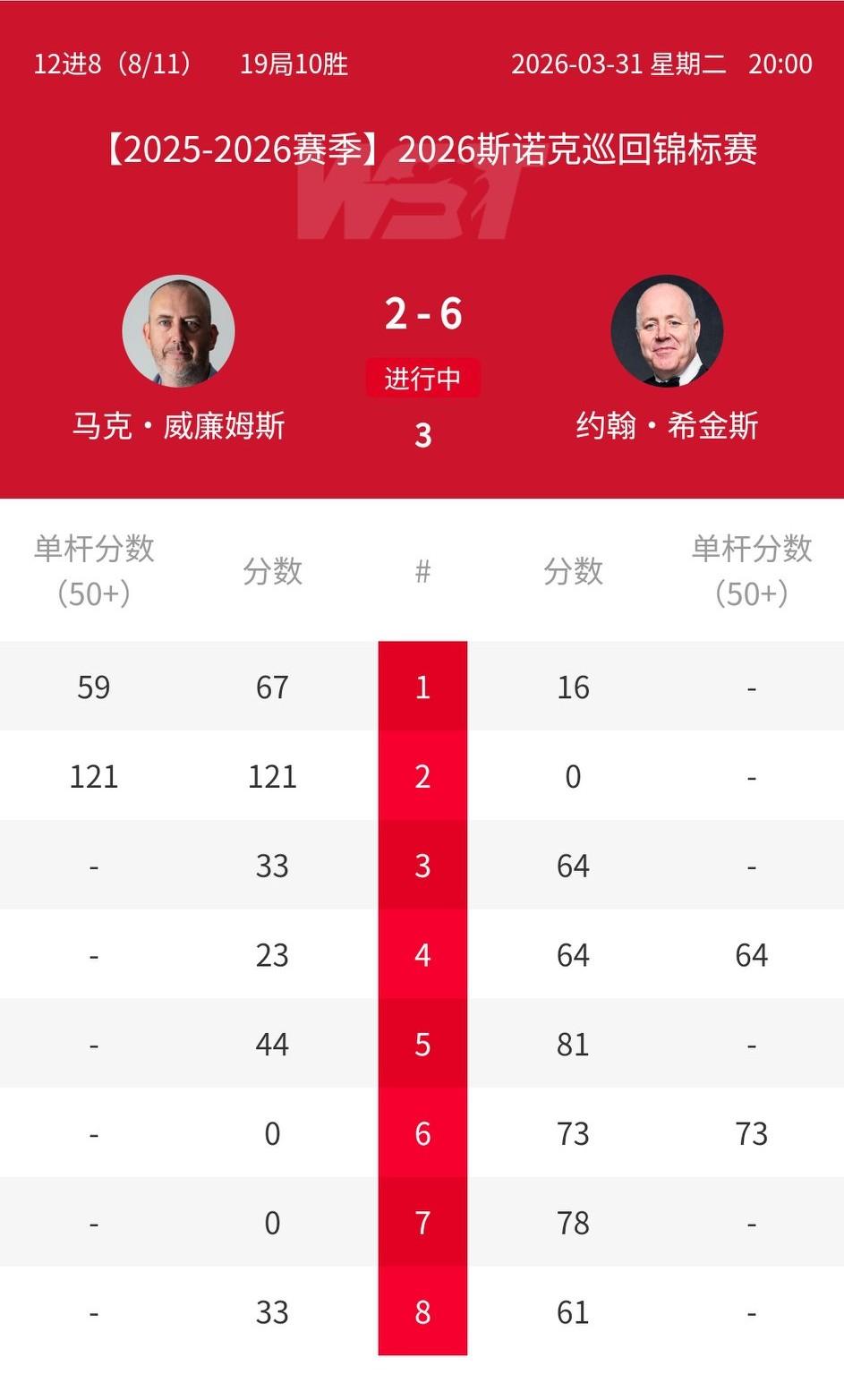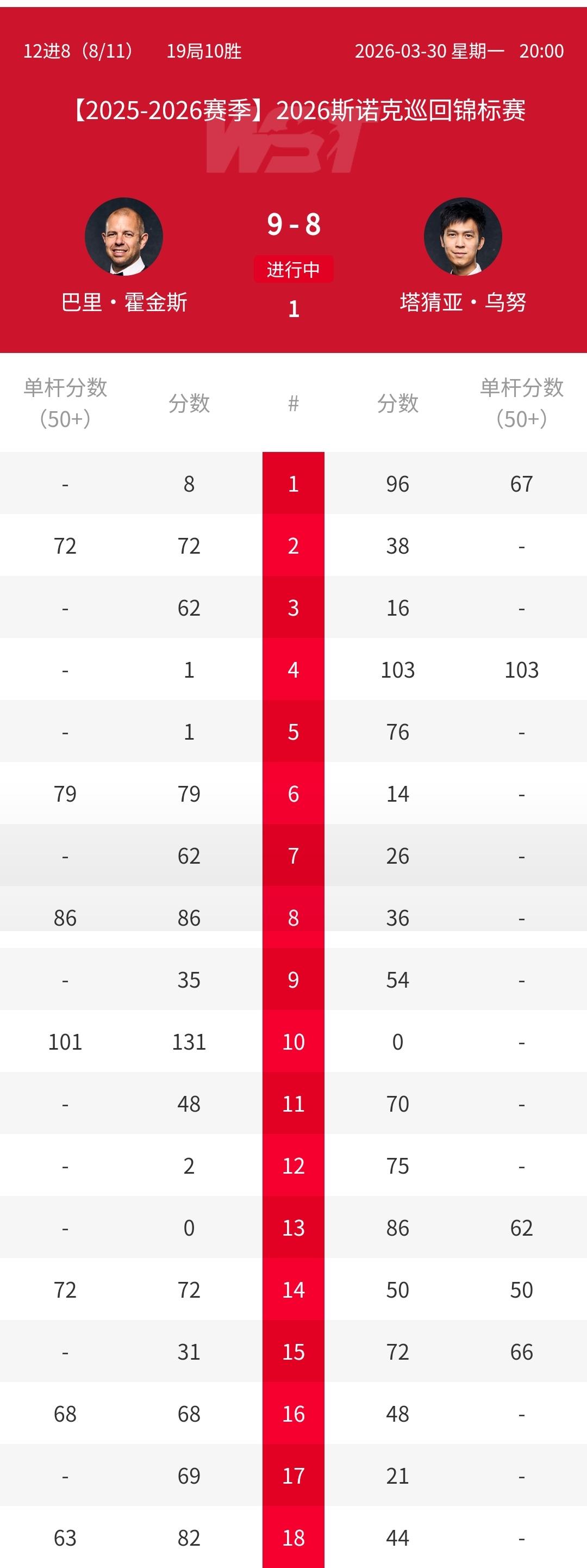 丁俊晖悬着的心终于放下来了,作为世锦赛第16号种子稳了!感谢霍金斯大力支持,塔猜亚止步巡回锦标赛12强。 第一阶段:霍金斯5-3塔猜亚 第二阶段:塔猜亚状态火热,霍金斯7-8落后,随后霍师傅连胜三局,最终10-8击败塔猜亚。 塔猜亚出局,最大的受益者自然是丁主任,他可以直通克鲁斯堡了。 隔壁桌的比赛是75两杰的较量,马威先赢两局,随后被希金斯连胜6局,第一阶段结束,马威2-6希金斯。