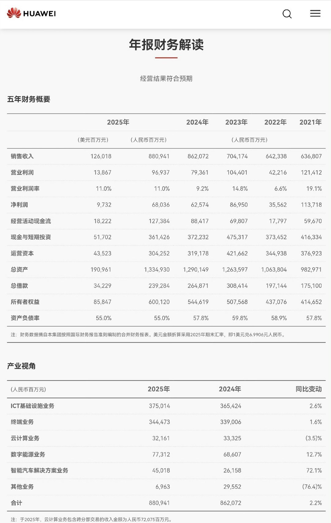 【华为发布2025年报:营收8809亿,全年研发支出达到了1923亿元,汽车业务猛增72%,净利润680亿元】
