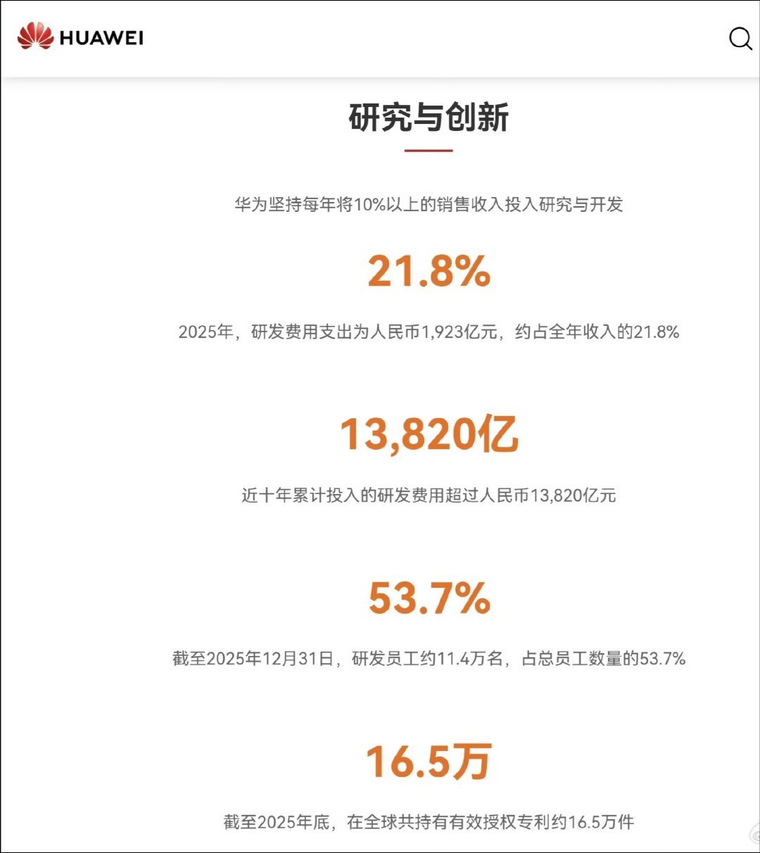 2025年,华为研发支出达1923亿元,约占全年收入的21.8%,创下历史新高。
