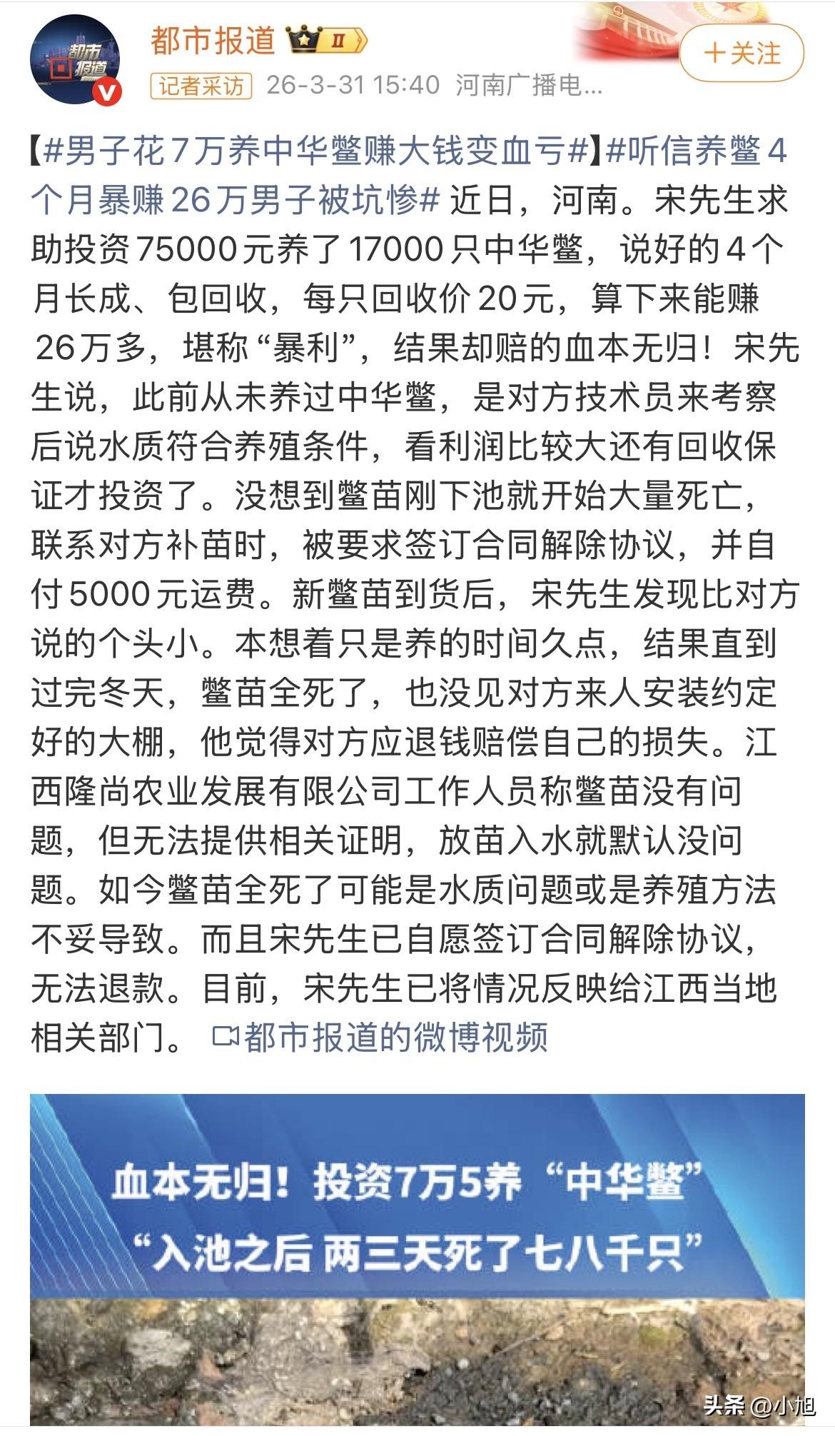 “也不想想为什么暴利的事情会找你呀”,河南的宋先生投了七万五千块,养了一万七千只中华鳖。当时对方把账给他算得明明白白:养四个月就长成,公司包回收,一只回收价二十块钱。宋先生掰着指头一算,好家伙,能赚二十六万。 这年头,干什么能四个月翻三倍多? 宋先生动心了。他之前从没养过鳖,但对方派了技术员来,考察完说他这儿水质没问题。又有合同,又包回收,看着是稳赚不赔的买卖。 钱投进去,苗子刚下池,事情就不对了。 鳖苗开始成片地死。宋先生慌了,赶紧联系公司。公司倒是爽快,说补苗可以,但得先签个合同解除协议,再自掏五千块运费。 宋先生这时候还没意识到问题的严重性,签了字,付了钱,等着新苗子。 新苗子到了,宋先生一看,心凉了半截——比当初说好的个头小了一大圈。但苗子都到了,总不能再退回去,他想,大不了多养些日子。 问题是,鳖这种东西,过冬是个坎。 技术资料上写得清清楚楚,稚鳖越冬死亡率本来就高,得有温室大棚保温,水温得稳住。正规的养殖模式下,中华鳖的养殖周期根本不是四个月,而是两年起步。那些集约化养殖场收回投资都得四年多,你一个门外汉想在院子里四个月赚翻倍,这账怎么算都不对。 宋先生等啊等,始终没见着公司承诺的大棚。冬天一来,池子里的鳖苗扛不住,全军覆没。 七万五千块,连个响儿都没听见。 宋先生找公司讨说法,对方一句话把他噎了回去:苗子没问题,是你水质不行,或者养殖方法不对。至于那个合同解除协议,是你自己签的,想退款没门。 这事有意思的地方在这儿。 宋先生签的那份解除协议,才是真正的杀招。他当时以为只是补苗的手续,实际上等于把自己之前的合同权利全放弃了。补来的苗子个头小,他认了;大棚没装,他等了;等到鳖全死了,他再去找公司,人家拿出协议,合法合规,你签字了。 这叫什么?这叫用正规手续干不正规的事。 农业农村部、公安部、市场监管总局去年就联合发过提示,专门点名了这种“订单农业”骗局的套路:选小众品种、用互联网吹嘘高回报、承诺明显偏离市场行情的回收价、缺乏实体产业支撑、高价捆绑销售劣质种苗。宋先生踩的每一个坑,都在这个提示里写得明明白白。 更关键的是,这类骗局还有一个典型特征:技术员会故意教错误的技术,或者干脆不提供指导,让你自己养死,这样他们就不用履行回购义务了。宋先生的那个大棚,从一开始就没打算装。 宋先生现在把情况反映给了江西当地相关部门。但钱能不能追回来,悬。 这种“公司+农户”的订单农业模式,本来是个好东西,能帮农民解决销路问题。农业农村部今年3月底刚出了规范指引,要求合同里必须写清楚技术指导怎么提供、回收标准是什么。但再好的规定,也架不住有人专门钻空子。 宋先生这七万五,算是给大伙交了个学费。 你在村里见过这种“包回收”的套路吗? 来源:都市报道、农业农村部、公安部、市场监管总局联合发布的风险提示及相关新闻报道