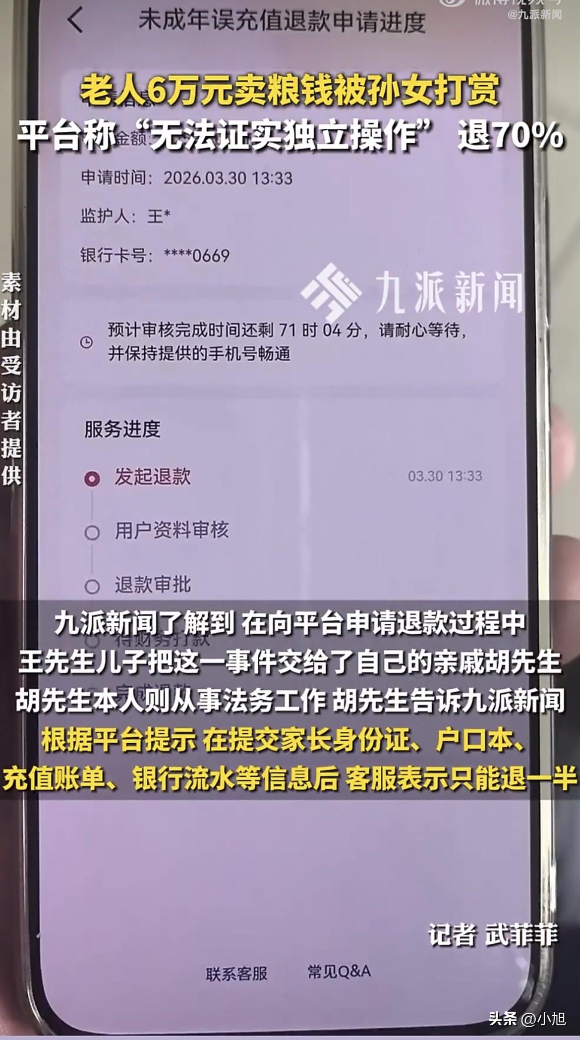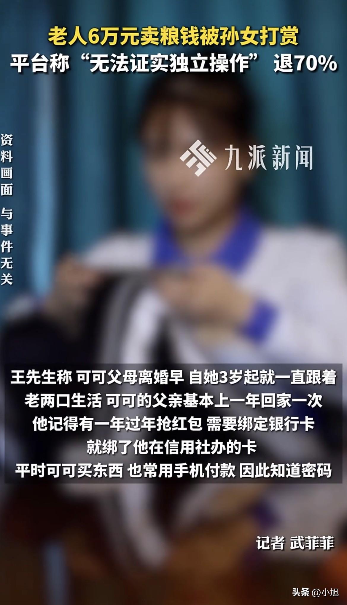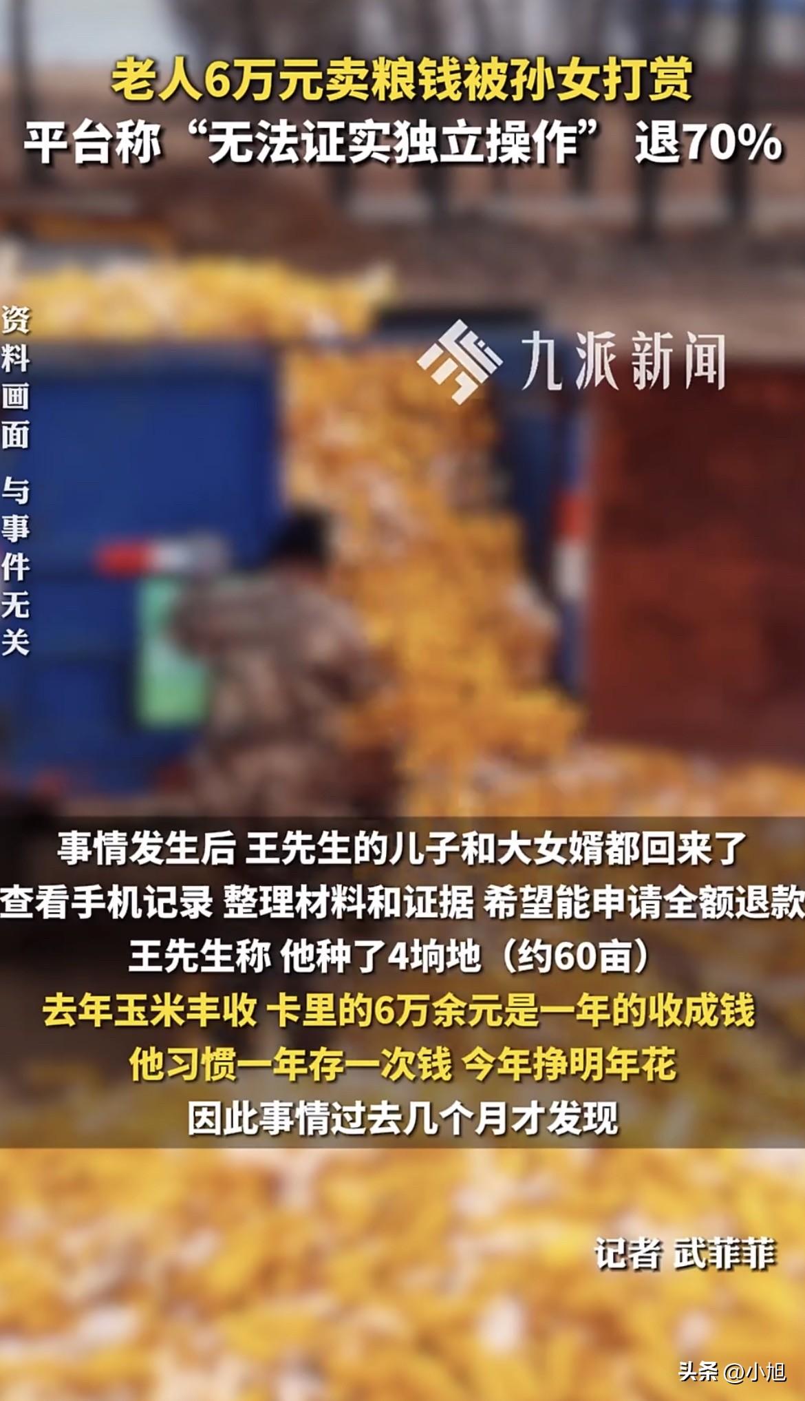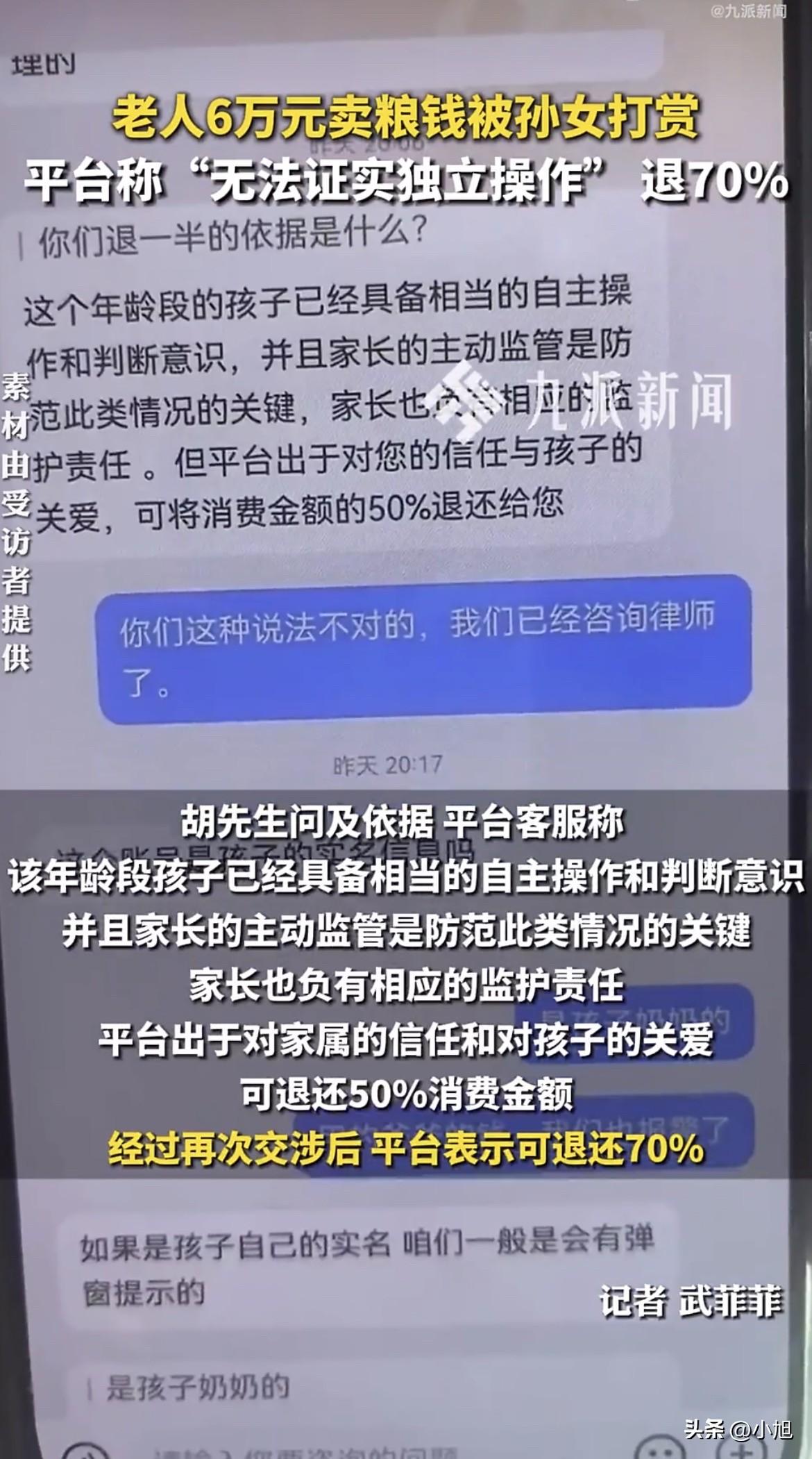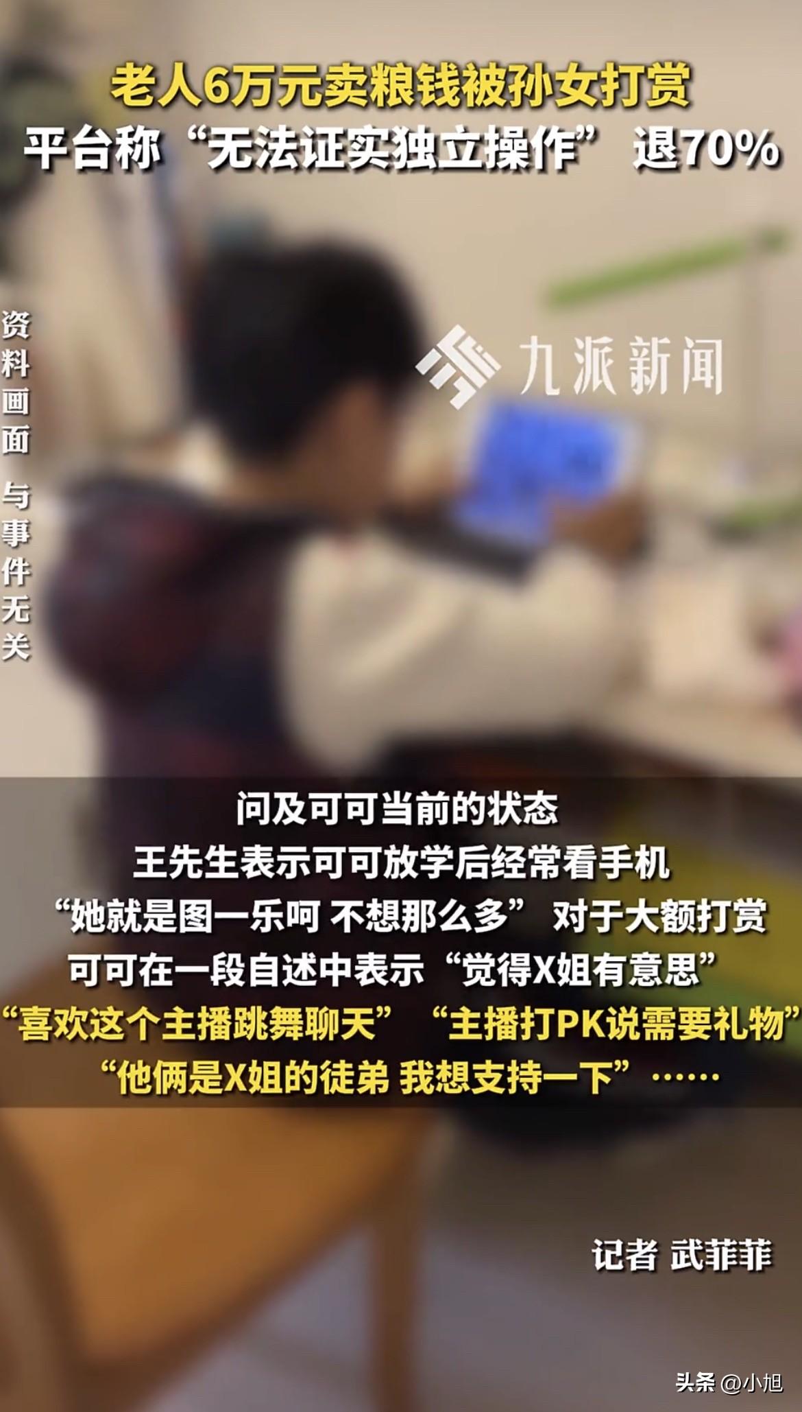 吉林白城,66岁的王大爷骑着三轮车去镇上信用社取钱。 他要买化肥和种子,马上就得种地了。 卡递进去,工作人员查了一下,抬头看他:大爷,卡里没钱了。 王大爷以为对方看错了。去年玉米丰收,四垧地打了六万多块钱,他全存这张卡里了。他种了一辈子地,习惯一年存一次,今年挣的明年花。这笔钱是他今年全部的指望。 工作人员又查了一遍,还是那个结果。 王大爷从信用社出来,骑着三轮车去了派出所。民警一查银行卡流水,发现钱全进了直播平台,一笔接一笔,加起来六万多。打赏出去的。 打赏的人是他15岁的孙女,可可。 可可三岁起就跟爷爷奶奶过。她爸妈离婚早,她爸在河北打工,一年到头就过年回来一次。王大爷66岁,不识字,这两年才用上智能手机,还是孩子们淘汰下来的。他连短信都看不利索,更不懂什么直播、快币、打赏。 那这钱怎么出去的? 王大爷后来才弄明白,有一年过年抢红包,家里人帮他绑过一次银行卡,之后就再没管过。可可平时买东西用手机付款,密码她也知道。他哪想得到,这手机里能藏这么大一个窟窿。 可可爸从河北赶回来,气得要打孩子。 王大爷拦住了。他跟儿子说:就这一个孙女,从三岁就扔给我,我能舍得打她吗? 这句话里有太多东西。一个66岁的老人,种地,闲了打零工,勉强顾着祖孙三人的生活。孙女从三岁起就是他带大的,他舍不得打,不是因为不生气,是因为那是他一手拉扯大的孩子。 可可在一段自述里说了打赏的原因。她说“觉得X姐有意思”“喜欢这个主播跳舞聊天”“主播打PK说需要礼物”“他俩是X姐的徒弟,我想支持一下”。 六万多块钱,就这么一笔一笔刷出去了。 她可能真的只是“图一乐呵”。王大爷说,可可放学回来还看手机。她不懂那六万块钱意味着什么——那是一个66岁老人一年的收成,是地里刨出来的,是马上要买的化肥和种子。 可可爸把退款的事交给了亲戚胡先生。胡先生搞法务,帮着走流程。 按平台提示,胡先生提交了家长身份证、户口本、充值账单、银行流水。材料交齐了,平台客服回复:只能退50%。 理由是什么呢?客服说:这个年龄段的孩子已经具备相当的自主操作和判断意识,家长的主动监管是防范此类情况的关键,家长也负有相应的监护责任。平台出于对家属的信任和对孩子的关爱,可退还50%。 胡先生又交涉了一轮,平台松口了,说退70%。 但退70%也不能全退。新的理由是:无法证实是未成年人独立操作的。 胡先生听出问题了——一边说孩子有自主意识,所以家长要担责;一边又说没法证明是孩子自己操作的。那到底是孩子干的还是大人干的?平台也没给个准话。 湖北乾行律师事务所的周美琪律师分析了这件事。 她说,15岁属于限制民事行为能力人,按民法典规定,这么大笔钱的打赏,没经过监护人同意,法律上是无效的,钱应该返还。这是有明确法律依据的。 至于平台说只退一半,律师提到,在过往案例里确实有过判退一半的,比如北京一个案子,17岁女孩打赏45万,法院判平台退24万,因为家长没管好银行卡,平台审核也不严,两边都有错。 但这个案子不一样。 王大爷不会用智能手机,银行卡是被偷偷绑的,密码也是孩子自己知道的。这能算家长主动放任吗?律师说,平台作为专业运营方,有技术手段也有风控能力,但从来没主动干预过,这次平台的过错可能更大。 还有一点关键——举证责任的问题。 平台说“没法证明是孩子独立操作”。但律师的意思是,家属已经把能拿的证据都拿了,户口本、银行流水、充值记录,全交了。剩下的操作数据、登录IP、设备信息,都在平台手里。平台要是觉得不是孩子干的,应该平台来举证。让一个66岁的老人自证清白,这不合理。 胡先生又交了新材料,还在等结果。 王大爷种了一辈子地,一年就攒下这六万多。 那是地里刨出来的,是一年的收成,是马上要买的化肥和种子。 可可放学回来还看手机。她不知道,她随手刷出去的那些礼物,是她爷爷明年种地的全部家当。 你觉得平台只退70%,合理吗? 来源:九派新闻
