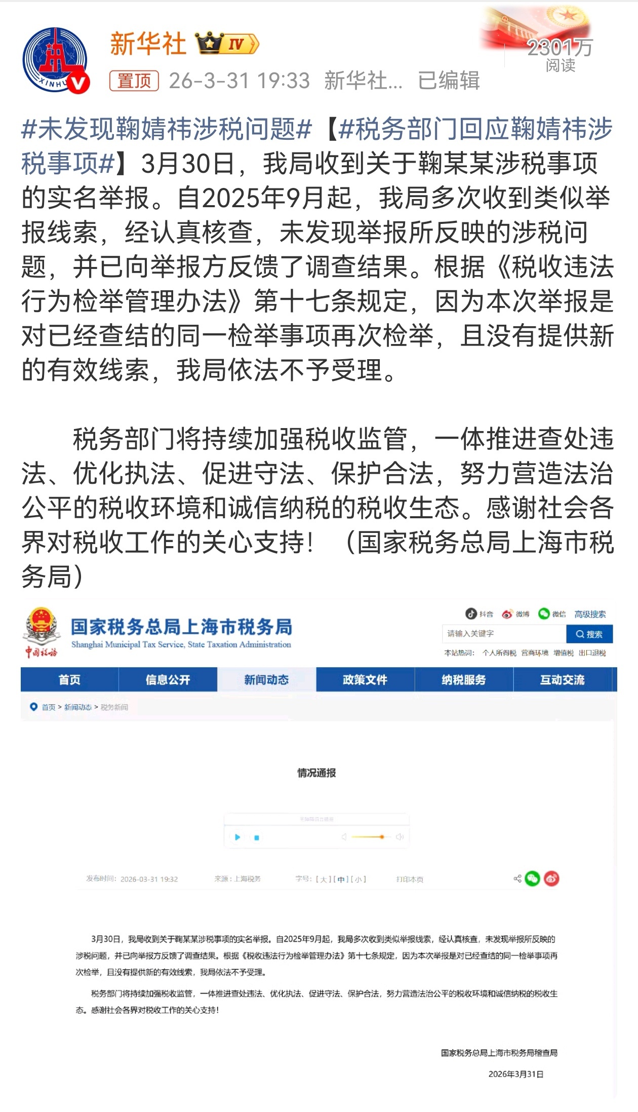 3月31日,国家税务总局上海市税务局通报,自2025年9月起多次核查鞠某某涉税线索,均未发现涉税问题。不久前的丝芭三问鞠婧祎,被税务部门直接“打脸”,鞠婧祎此身分明了,成为首个被涉税举报后查无问题的明星。未发现鞠婧祎涉税问题第一个被举报后查完没问题的明星