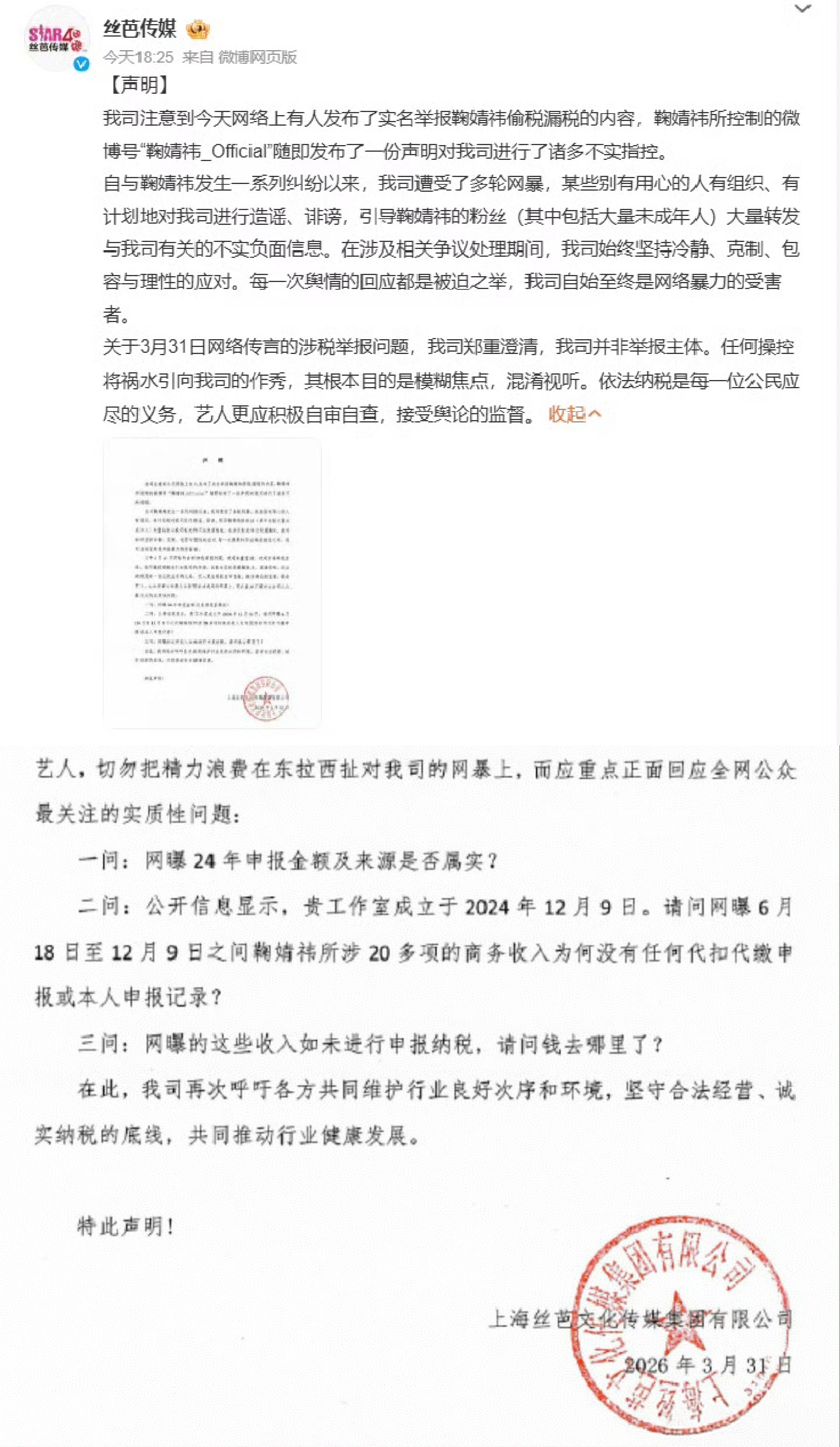 3月30日,丝芭传媒向上海税务实名举报鞠婧祎偷税漏税。3月31日,丝芭又发出看似舆论监督的“三问”,实则是借税务问题施压,试图将合约纠纷转化为公共舆论事件,引导公众质疑鞠婧祎的合规性。