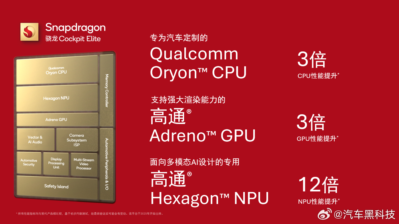 汽车黑科技 骁龙座舱平台至尊版(骁龙8397),该平台搭载了专为汽车定制的Oryon CPU,性能提升约3倍,确保每一次交互都丝滑流畅;Adreno GPU同样实现3倍性能跃升,可轻松驾驭120万面高精度3D建模,将沙漠、草原、雪地等全地形场景在座舱内真实还原,实现“所见即所行”。