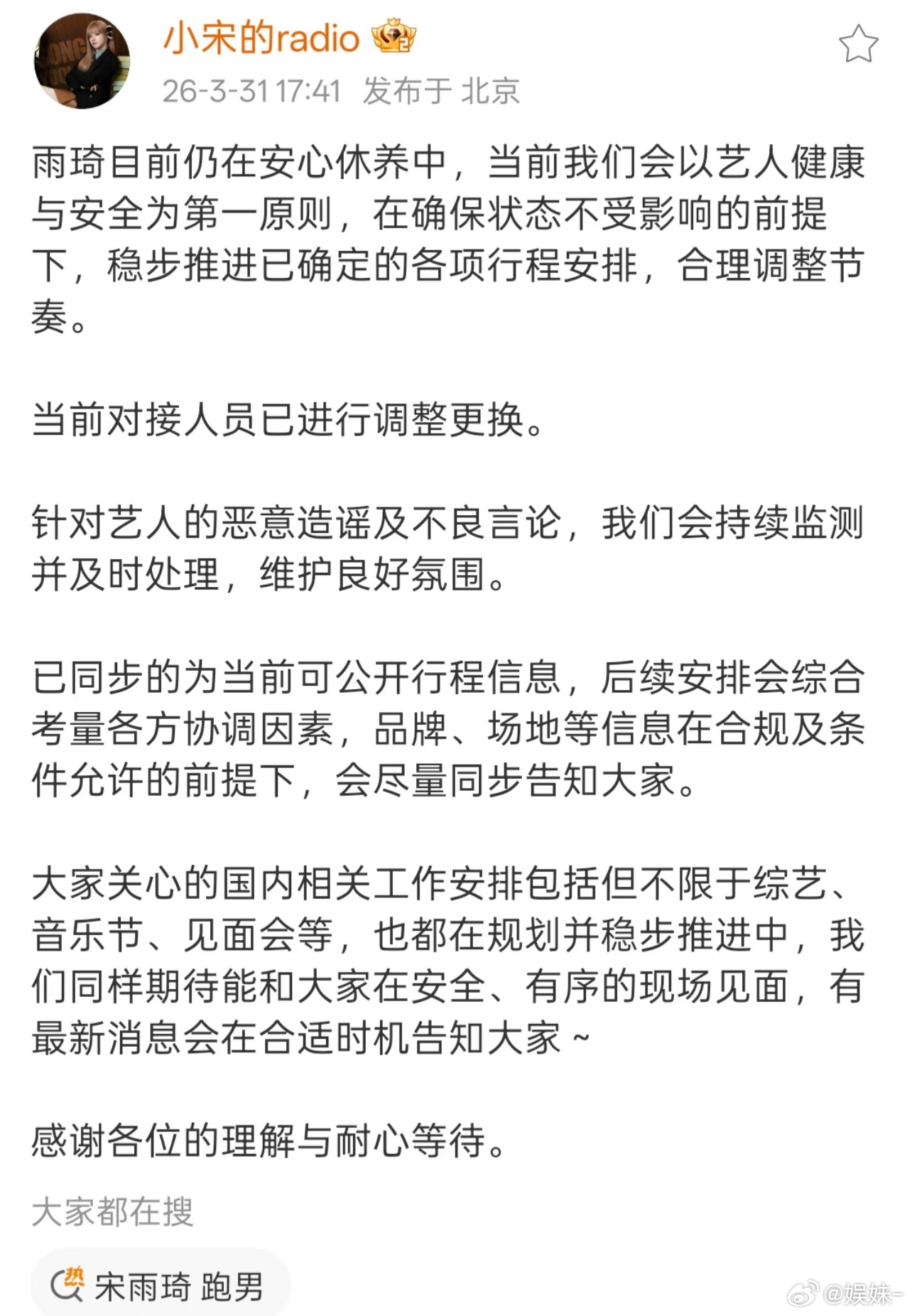 说了一堆然后确实录不了不怕粉丝疯吗宋雨琦对接回应不录跑男